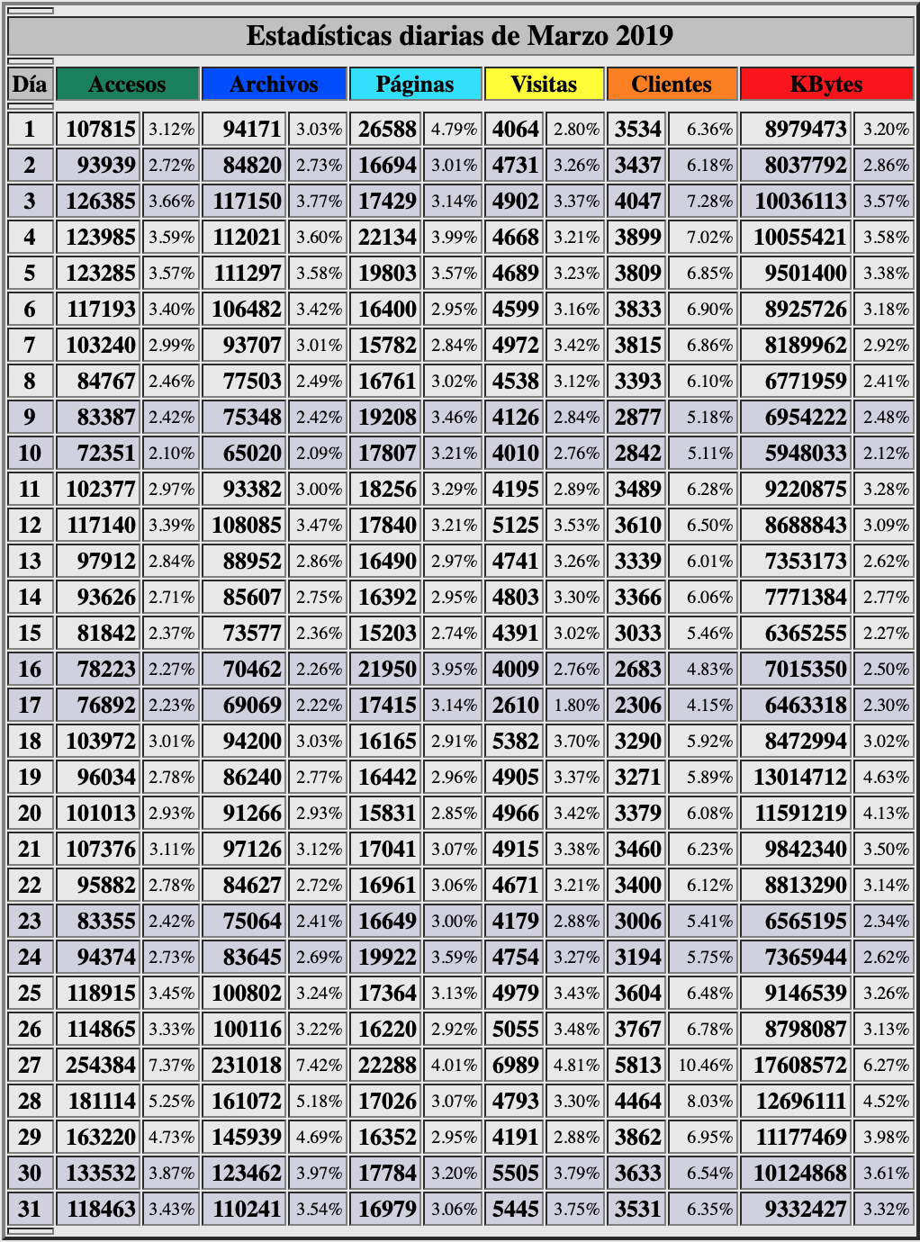 De nuevo les abrimos nuestras estadísticas y les agradecemos su seguimiento. Beckmesser es la única publicación especializada en música clásica que da a conocer transparentemente su difusión, que supera en mucho a todas las editadas en papel y en tres y cuatro veces a las demás digitales. Estas últimas presumen de casi llegar a las mil visitas diarias y la revista musical especializada en papel no supera los 3.000 ejemplares entre suscripciones y ventas. Beckmesser obtuvo 145.343 visitas durante el mes de marzo, con un promedio de 4.688 visitas diarias, y nada menos que 555.176 páginas leídas. Un nuevo record. Es decir, Beckmesser logra cada día mucha mayor difusión que cualquier revista en papel en un mes.