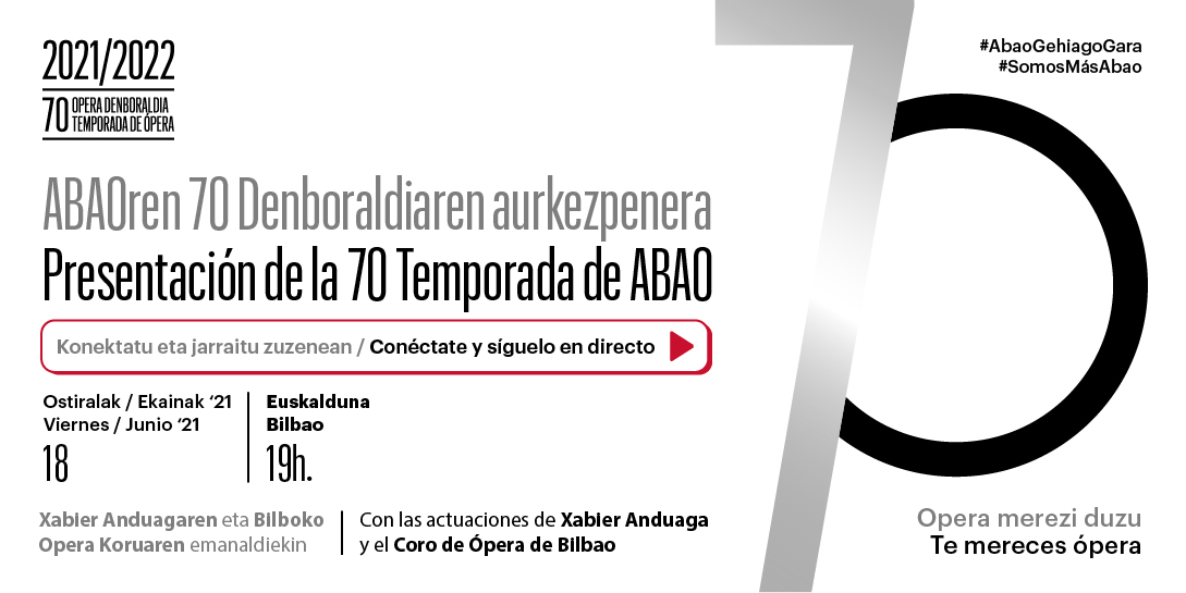 Tras haber tenido que detener y reprogramar parte de la actividad artística durante la pandemia, y haberse reinventado con nuevas propuestas como el exitoso programa ABAO on Stage, ABAO Bilbao Opera sigue trabajando en todo momento con la ilusión, el esfuerzo y el mismo objetivo de siempre: difundir la cultura y la ópera, y presenta la temporada 2021-2022 sobre un escenario de optimismo y esperanza en el retorno paulatino de la mayor normalidad posible.