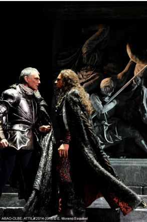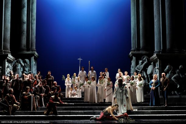 El Bilbao hemos asistido a una representación aceptable, si se quiere, aunque irregular. Una producción tradicional y atractiva, aunque corta de vida escénica, una notable dirección musical, y un cuarteto solista con desequilibrios notables. La producción escénica procedía de Lieja y llevaba la firma de Ruggero Raimondi, sin duda uno de los grandes intérpretes de Attila en el último cuarto del siglo XX. La escenografía de Daniel Bianco consiste en unas cuantas columnas, con bajo-relieves con motivos bélicos en la parte inferior, cuyo movimiento sitúa las distintas escenas. A eso hay que añadir un ciclorama al fondo. Todo ello resulta atractivo, además de tradicional. El vestuario de Laura Losurdo resulta adecuado y tradicional en todos los casos. Buena la iluminación de Albert Faura.
