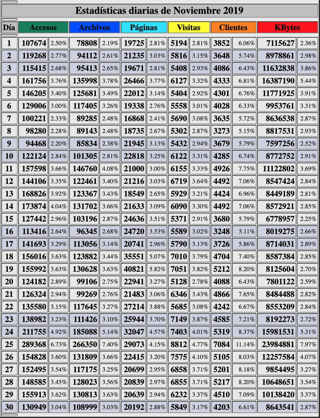 Aquí nuestras estadísticas en noviembre de 2019 a través de los contadores de nuestro servidor. No hay otra publicación musical en internet que ofrezca abiertamente sus propios contadores.