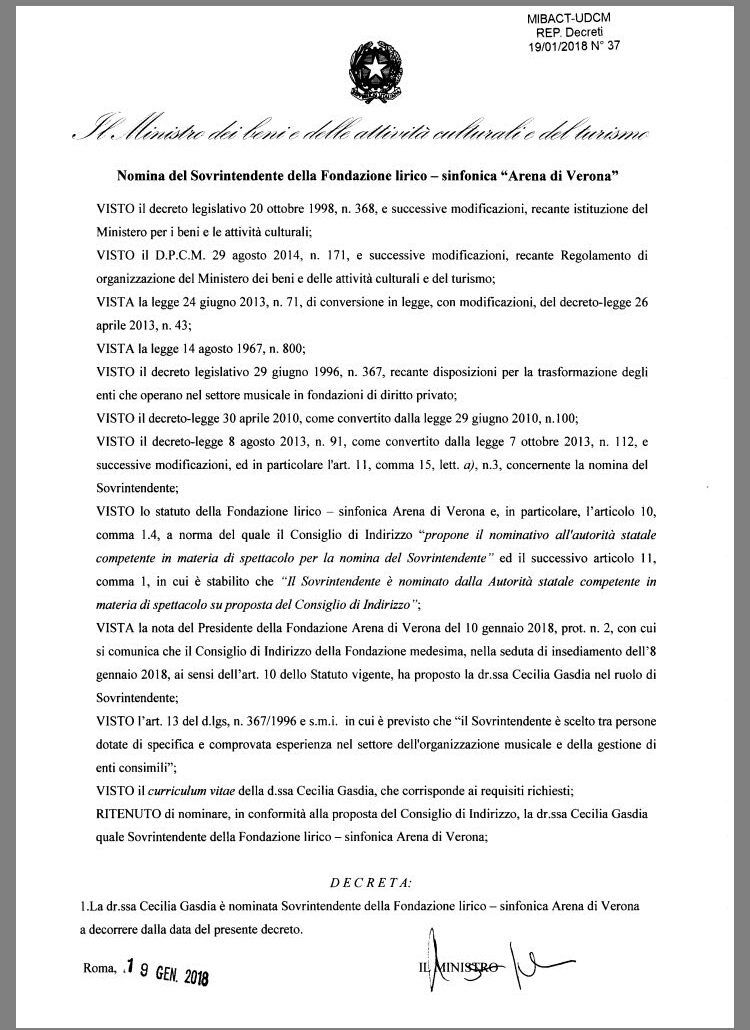 La soprano Cecilia Gasdía fue nombrada ayer, de forma oficial, como nueva intendente de la ópera en la Arena de Verona. Les adjuntamos, como primicia, su nombramiento oficial.