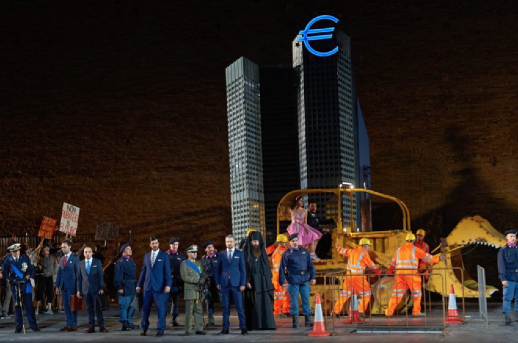 Se trata de un nuevo trabajo del británico Graham Vick, que se estrenó en el Festival de Macerata durante el verano pasado, siendo recibida por la crítica con alguna división de opiniones. Come es habitual en Graham Vick, la acción se trae a tiempos modernos y no faltan referencias a la crisis migratoria, presentando el Palacio de Sarastro como un lugar de poder y armado con misiles. No falta en escena la fachada de San Pedro del Vaticano y una gran imagen de la Virgen María.