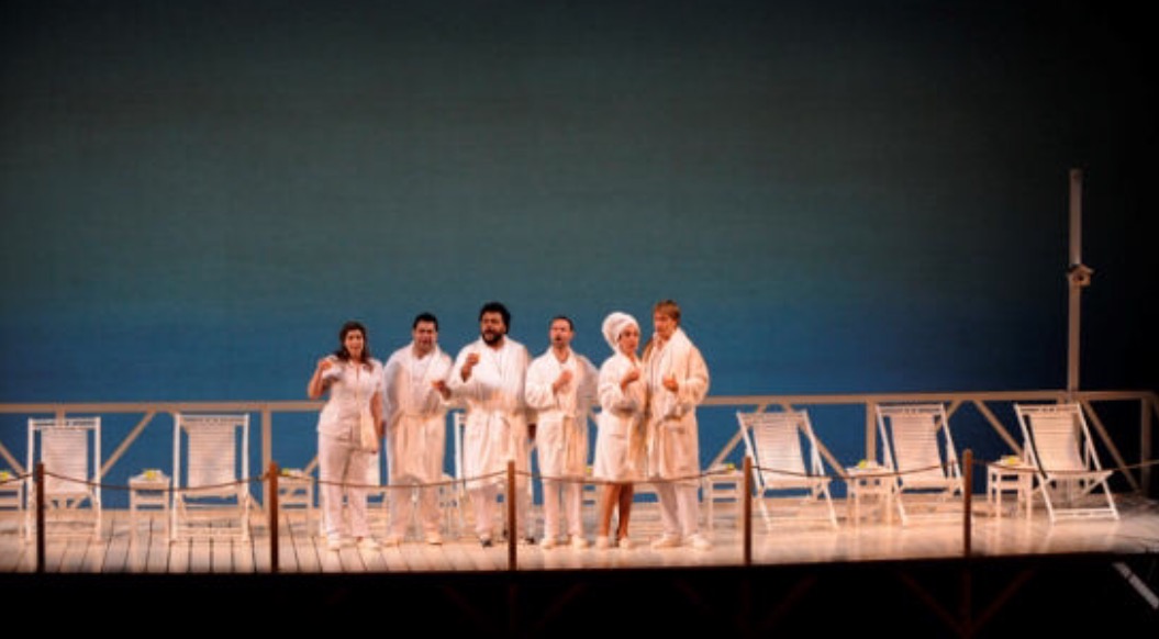 La producción no puede ser más simple, ya que no hay otra escenografía sino unas hamacas en el primer acto y unas bombillas para la fiesta del segundo. De hecho, resulta más económico preparar la producción in situ que transportarla desde Pésaro. Cuenta también para la fiesta del segundo acto con un atractivo vestuario de Pepa Ojanguren, mientras que en el primer acto no hay otra cosa que albornoces blancos.