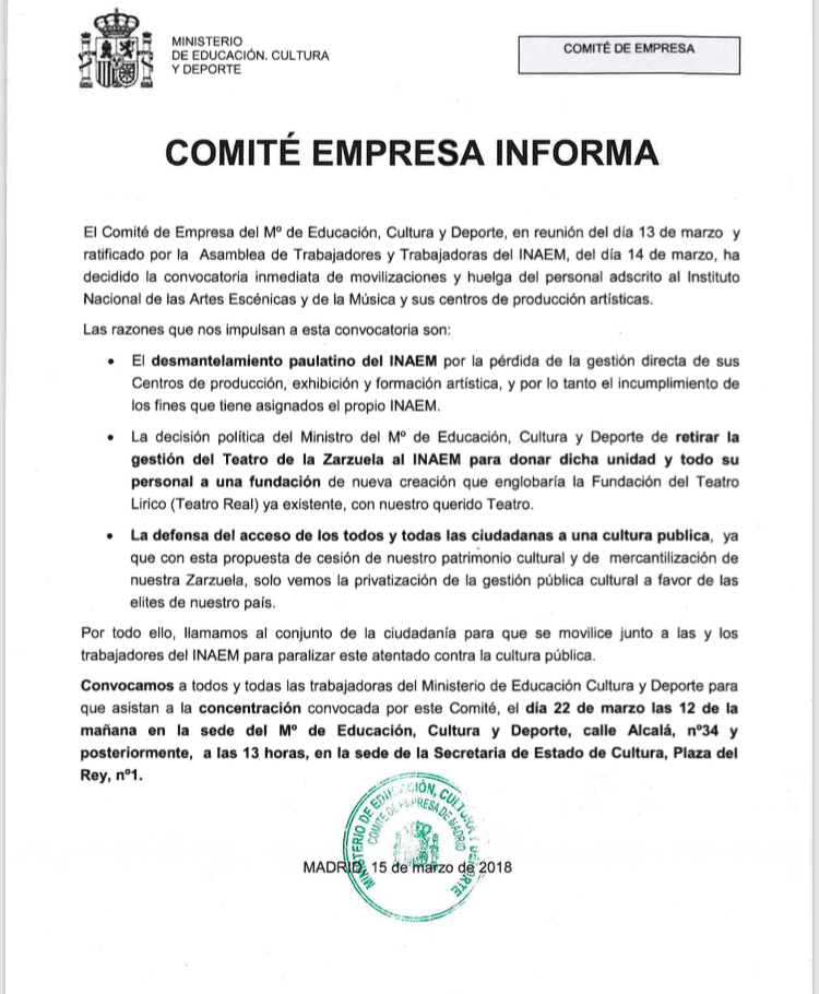 Con este manifiesto, se exige al Ministerio de Educación, Cultura y Deporte que mantenga la gestión completamente pública del Teatro de la Zarzuela, con el fin de que así se garantice una política de precios asequibles para todos y la excelencia artística que merece el teatro lírico español.