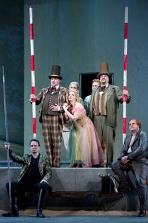 La escenografía ofrece un edificio de tipo neoclásico, con una plataforma elevada en el centro, que tanto sirve (con agua) par figurar el Rhin como para las evoluciones de los dioses y gigantes. Hay al fondo dos escaleras, una ascendente por donde los dioses entran en el Walhala, y otra descendente a la izquierda, poro donde aparecen los gigantes. La trama está bien narrada y únicamente no me resultaron convincentes las escenas de las transformaciones de Alberich en el Nibelheim. Bien conseguida la escena final, en la que los dioses desaparecen de escena y entran en la misma las Hijas del Rhin. El vestuario es adecuado y obra de Nicola Reichert, contando con una buena iluminación por parte de Michael Röger. Es una producción adecuada, que sirve perfectamente para narrar la trama.