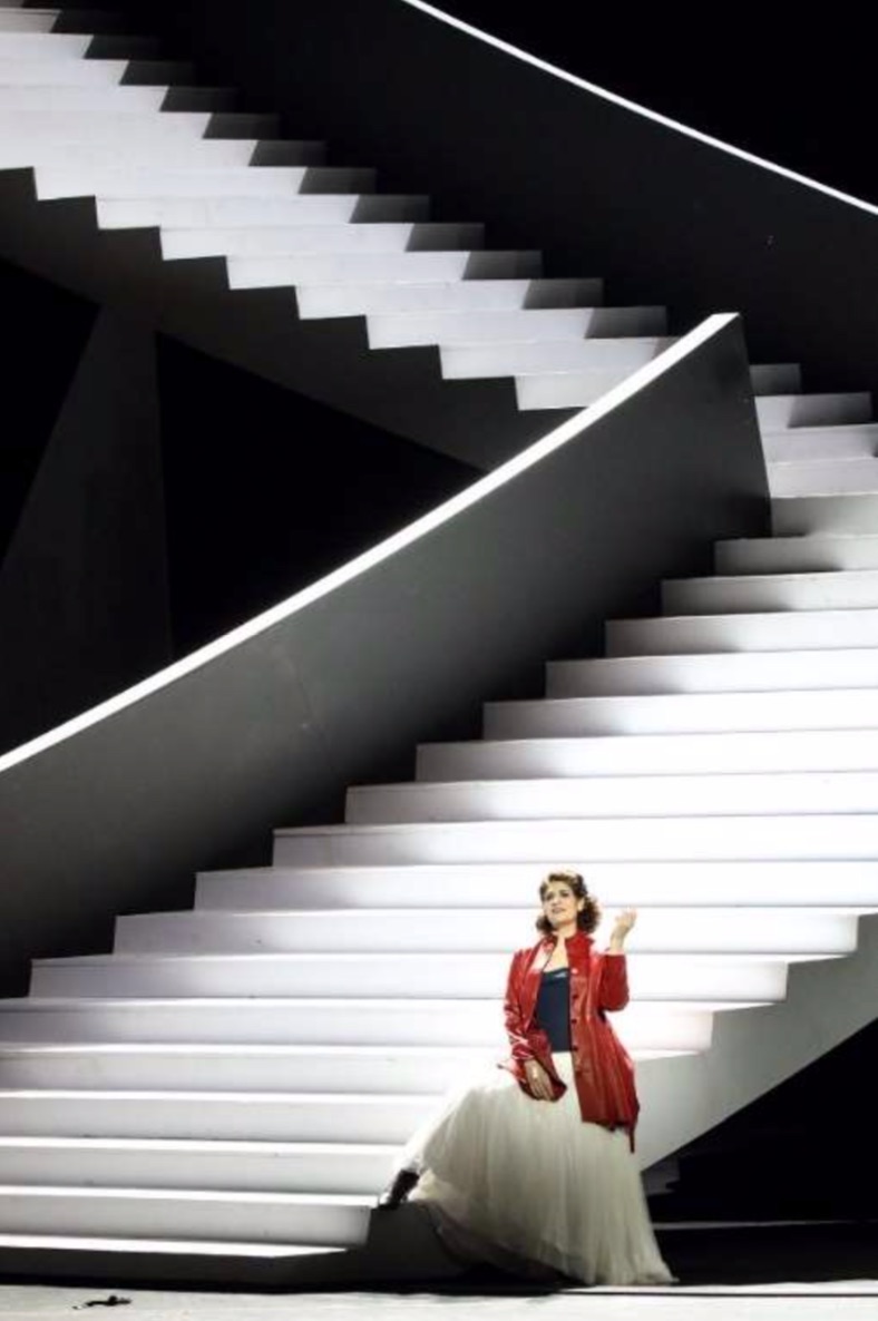 Se ha vuelto a ofrecer la producción de Andreas Dresen que se estrenara aquí en el Festival de Julio de 2015 y que tuve ocasión de ver y escribir sobre ella entonces. La producción resulta interesante y atractiva, aparte de algunas provocaciones de poco sentido en el segundo acto. La acción se trae a tiempos más modernos que los señalados por el libreto. Estamos seguramente en los años 30. La escenografía de Mathias Fischer- Dieskau ofrece un escenario giratorio dominado por una inmensa escalera blanca, que está presente a lo largo de toda la ópera. Esta gran escalera permite sacar un gran partido al escenario, ya que la acción se desarrolla en el acto I debajo de la misma (habitación de hotel de los Waldner) y en el resto de la ópera, tanto en la gran escalera, con todo el gran espacio que permite, como debajo de la misma. La verdad es que me ha parecido una escenografía atractiva y que ofrece muchísimas posibilidades escénicas, aparte de que una gran escalera es consustancial con esta ópera. El vestuario de Sabine Greunig es muy atractivo en el caso de Arabella y juega con colores negros en los invitados al baile del segundo acto y con el rojo en el caso de las invitadas, en un contraste muy bien conseguido con el blanco de la escalera. Buena también la iluminación de Michael Bauer.
