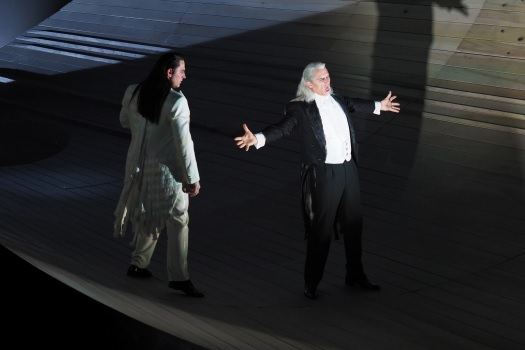 La dirección escénica de Dmitry Bertman resulta adecuada, centrando el drama en la oposición del Demonio y el Ángel, el primero avejentado, con el cabello blanco y vestido de negro y el segundo justo todo lo contrario. Buscando el contraste, el regista ha querido que la parte del Ángel fuera interpretada por un hombre, en este caso un contratenor.