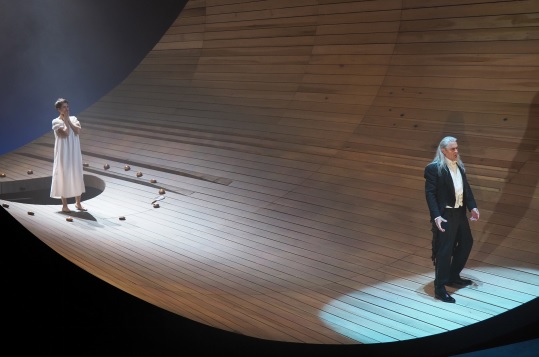 La producción se debe al ruso Dmitry Bertman y, como digo más arriba, es una coproducción del Liceu de Barcelona el Helikon de Moscú, la Opera de Nurenmberg y la Ópera de Burdeos. La producción resulta adecuada dentro de una cierta simplicidad, La escenografía es obra de Hartmut Schörghofer y consiste en un gran túnel de madera que va del frente al fondo del escenario, cerrándolo un gran globo, en el que se proyectan imágenes relativas a la ubicación de las distintas escenas. El vestuario es moderno y también obra de Hartmut Schörghofer. Hay que destacar la estupenda iluminación de Thomas C. Hase.