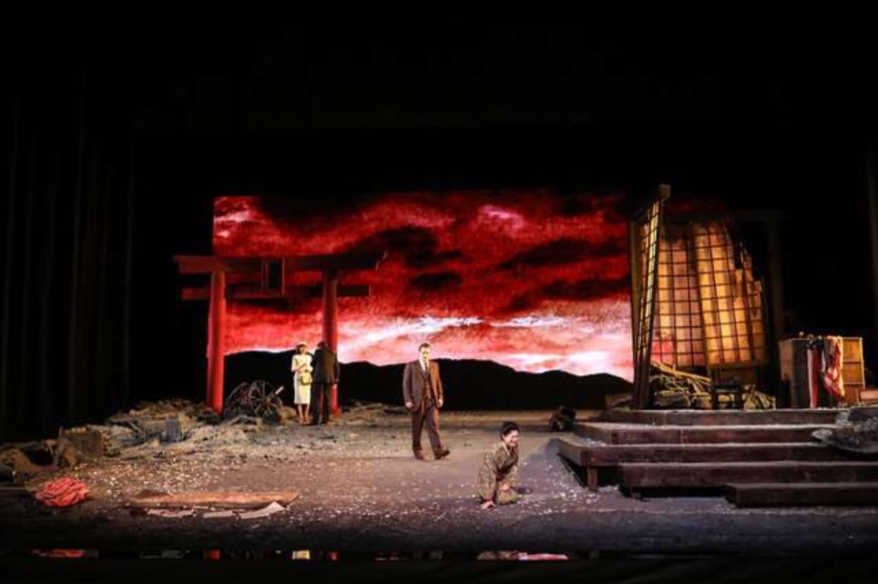 La producción escénica ofrecida lleva la firma del valenciano Emilio López, habiéndose estrenado en el Palau de Les Arts en Octubre de 2017. Ya desde el telón inicial se nos anuncia que estamos en Nagasaki y su destrucción por la bomba atómica, lo que no tiene mucho sentido, pero tampoco molesta. El primer acto ofrece una escenografía (Manuel Zuriaga) bastante habitual, apareciendo la casa en los dos últimos actos prácticamente en ruinas como consecuencia del bombardeo. El vestuario (Mónica Teijeiro) es muy clásico y un tanto rutinario y la iluminación (Antonio Castro) no resulta convincente, especialmente con un segundo acto, que se desarrolla sorprendentemente de noche. En su conjunto, es una producción bastante rutinaria y sin mucho interés.