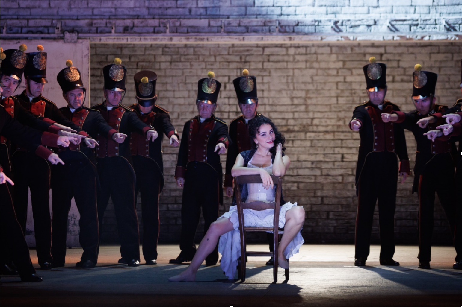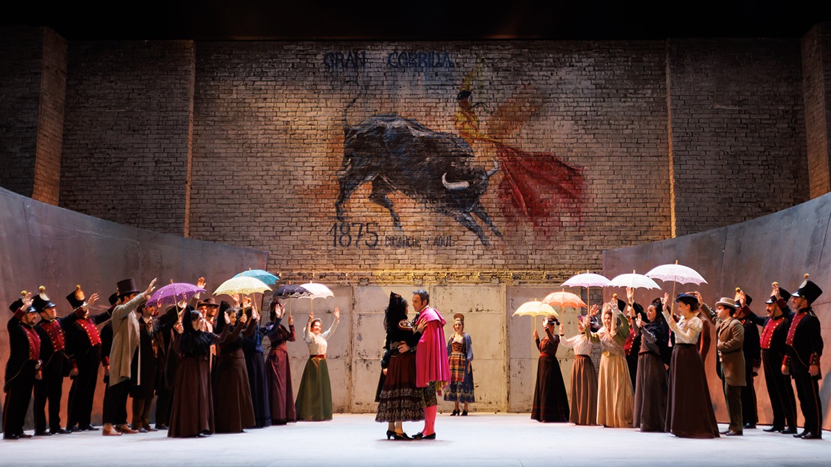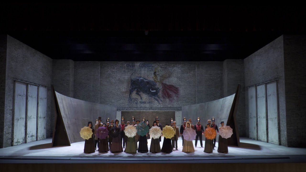 La producción arranca en una especie de visión retrospectiva con la muerte de Carmen a manos de Don José, lo que tiene lugar durante el preludio orquestal. El trabajo escénico es bastante clásico, desarrollándose en la época del estreno de la ópera y con una escenografía simple (Rudy Sabounghi), consistente en un par de muros móviles a los que se añaden elementos de atrezzo para las distintas enscenas. Por atrás hay una gran pared, por donde salen los artistas, ofreciendo en la parte de arriba una especie de cartel de toros con la fecha de 1875, que es precisamenete el año de su estreno en París. En el tercer acto desaparece el mencionado cartel y en el último acto se sustituye por imágenes de videos de la corrida de toros, llamando la atención que la producción confunde el desfile de cuadrillas a la plaza con el paseillo, que es lo que se ofrece en imágenes.