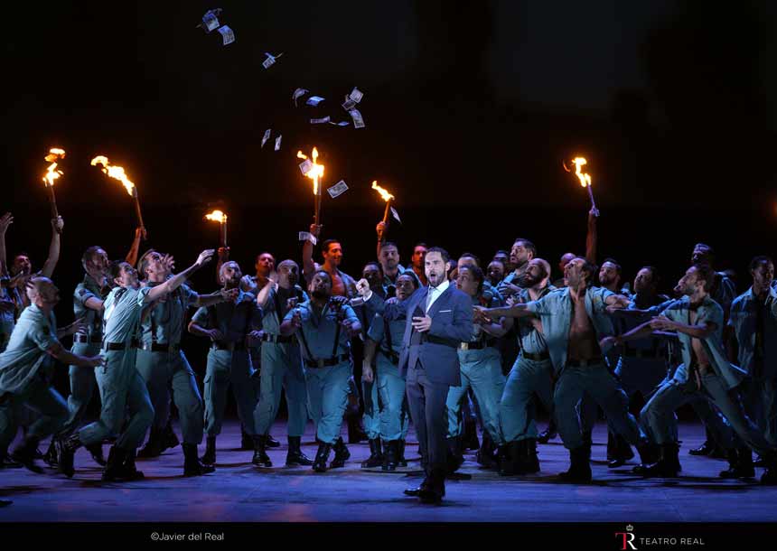 Un bronco ambiente cuartelario impera en esta versión, contagiando al coro, que vocifera, y a la batuta de Marc Piollet, que empuja a la orquesta con la energía imperiosa de un supuesto toque de queda. El cuarteto protagonista hace gala de una excelente salud vocal, que se despliega pletórica en un irregular dibujo de cada personaje. Francesco Meli es un Don José destemplado y a menudo gritón, frente a la entusiasta pero difuminada Micaela de Eleonora Buratto; Kyle Ketelsen apechuga valeroso con el imposible Escamillo.
