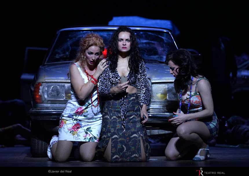 El hallazgo de Bieito fue tomar todos los elementos pintorescos y exóticos del libreto de Ludovic Halévy y Henri Meilhac a partir de la novela de Prosper Mérimée y llevarlos al terreno de la iconografía. Así, los militares se transformaron en soldados de la Legión en un puesto fronterizo que podría ser perfectamente Ceuta. Las cigarreras pasaron a ser poligoneras y los contrabandistas lucieron cadenotes de oro combinado con chándal. En esa revisión, tuvieron un papel igualmente importante la figura del toro de Osborne (derribado y deconstruido en un potente golpe visual) y la bandera de España.