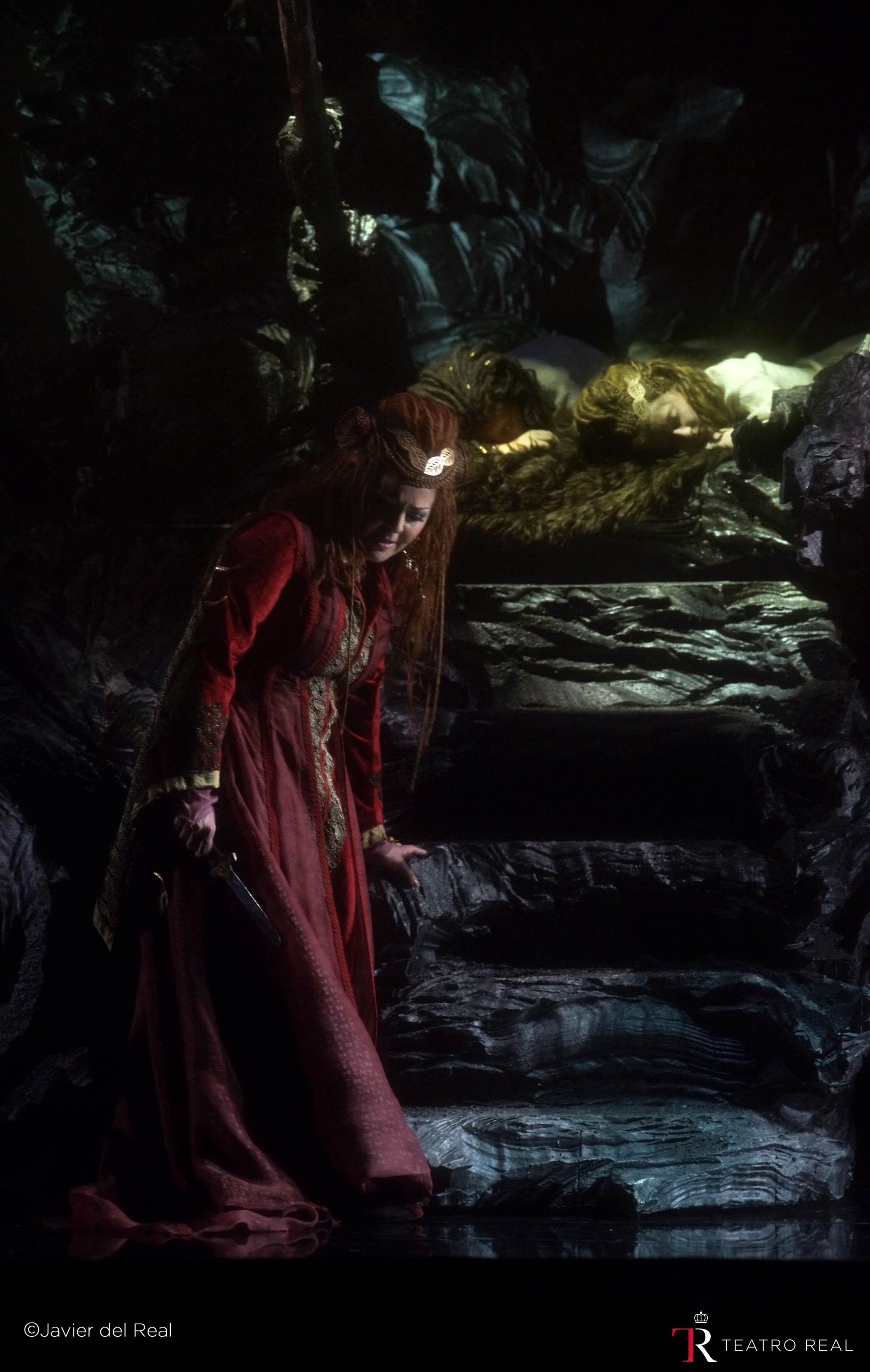 No hemos podido en esta ocasión madrileña apreciar en su totalidad y libremente estas bellezas. Ha habido problemas. El más grave ha sido sin duda el farragoso montaje de Davide Livermore, confeccionado a base de superposiciones de telas, de constantes, mareantes e innecesarias y redundantes proyecciones, de árboles simulados que, nunca mejor dicho, no dejaban ver el bosque; de colorines chillones, con vestuario propio de la tan popular serie Juego de tronos. Un enorme, gigantesco trono de árbol, leñoso y fantasmagórico –pero dotado de escaleras- presidía, en continua movilidad, toda la escena, por la que, de principio a fin, correteaban hombres y mujeres, desnudos y embetunados, pobre trasunto de lo que suponemos que serían trasgos de las espesuras druidas. Un constante ir y venir, una acumulación de efectos y efectismos impedían sumergirse en el flujo melódico.