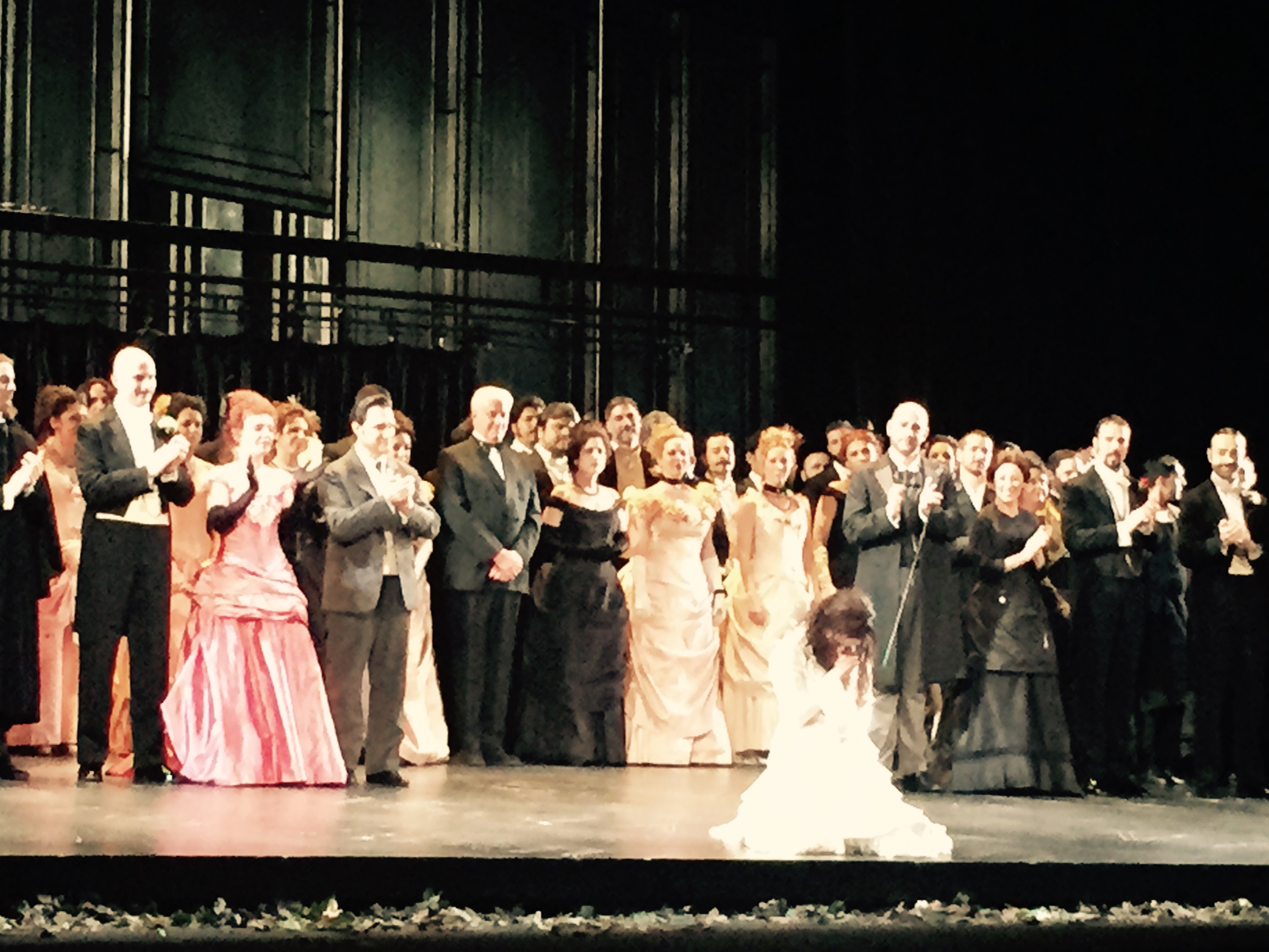 De momento, cabe reseñar que hubo aplausos dispuestos a consolar la inmensa pena de Violetta Valéry. También una buena cantidad de móviles en el primer acto: alguno dedicado a «whatsappear» en silencio durante el embrollo, otros empeñados en sonar durante el mismo. En realidad, pocas cosas animaban a prestar atención: de entrada, el maestro Renato Palumbo tropezaba con la concertación del coro, el tenor Francesco Demuro cantaba vulgarmente y la soprano albanesa Ermonela Jaho aparecía empequeñecida entre el timbre oscuro de la voz, un vibrato no siempre afortunado y una emisión calante.