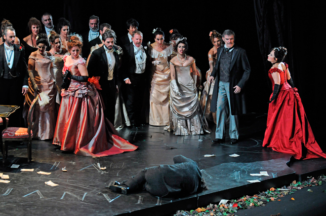 Alfredo recuerda: el día en que consiguió a la mujer que amaba en secreto desde hacía un año, el tiempo en que vivieron felices lejos del mundanal ruido, el día en que la perdió irremediablemente para que su padre salvara —o creyera salvar— el buen nombre de su familia, el día en que, tras reencontrarse, murió en sus brazos. Antes de que suenen los primeros acordes del Preludio, Violetta Valéry ya está muerta: el negro invade la escena, varios hombres, al fondo, inventarían sus enseres antes de ser subastados y Alfredo pasea cabizbajo ante su tumba. A partir de ahí, reconstruimos la historia de esta mujer en un escenario que parece renunciar a sus dimensiones reales para convertirse en uno mucho más reducido, opresivo a ratos, el que van construyendo a su antojo los fogonazos de la memoria para repasar el tránsito de una Violetta de vida disoluta (los cortinajes negros tienen tanto de presagio fúnebre como de refinado ambiente prostibulario), que se redime por amor y que acaba siendo mártir de este mismo sentimiento en un París que no es el que vio nacer las obras de Dumas y Verdi, sino uno alrededor de treinta años posterior, aún más podrido e hipócrita que el de los comienzos del Segundo Imperio, coetáneo de la falaz Vetusta de Ana Ozores.