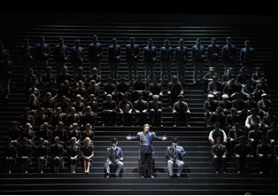 La producción de Daniele Abbado pasa sin pena ni gloria o, si ustedes prefieren, como un rayo de sol pasa por un cristal sin romperlo ni mancharlo (Catecismo del Padre Astete). La escenografía de Angelo Linzalata me recuerda mucho a la de la producción de Jürgen Rose de Munich, consistente en un espacio cerrado por paredes, que se abren para dejar paso a los artistas. Digamos que es una producción de bajo coste, que es lo que hoy se lleva, y que funciona mejor en las escenas intimistas que en las de masas, con una más bien pobre escena del Auto da Fe. El vestuario de Carla Teti resulta un tanto confuso, ya que parece hacer un guiño a Goya y su cuadrote de la familia de Carlos IV, puesto que el vestuario de la corte responde a esa época de fines del XVIII y principios del XIX, mientras que el pueblo llano parece no haberse movido del XVI. No sé si trata de un homenaje de Abbado a Goya o simplemente de querer dar más colorido a la producción. En un ambiente oscuro, que predomina durante toda la producción, se podía esperar un trabajo de iluminación más brillante por parte de Alessandro Carletti.