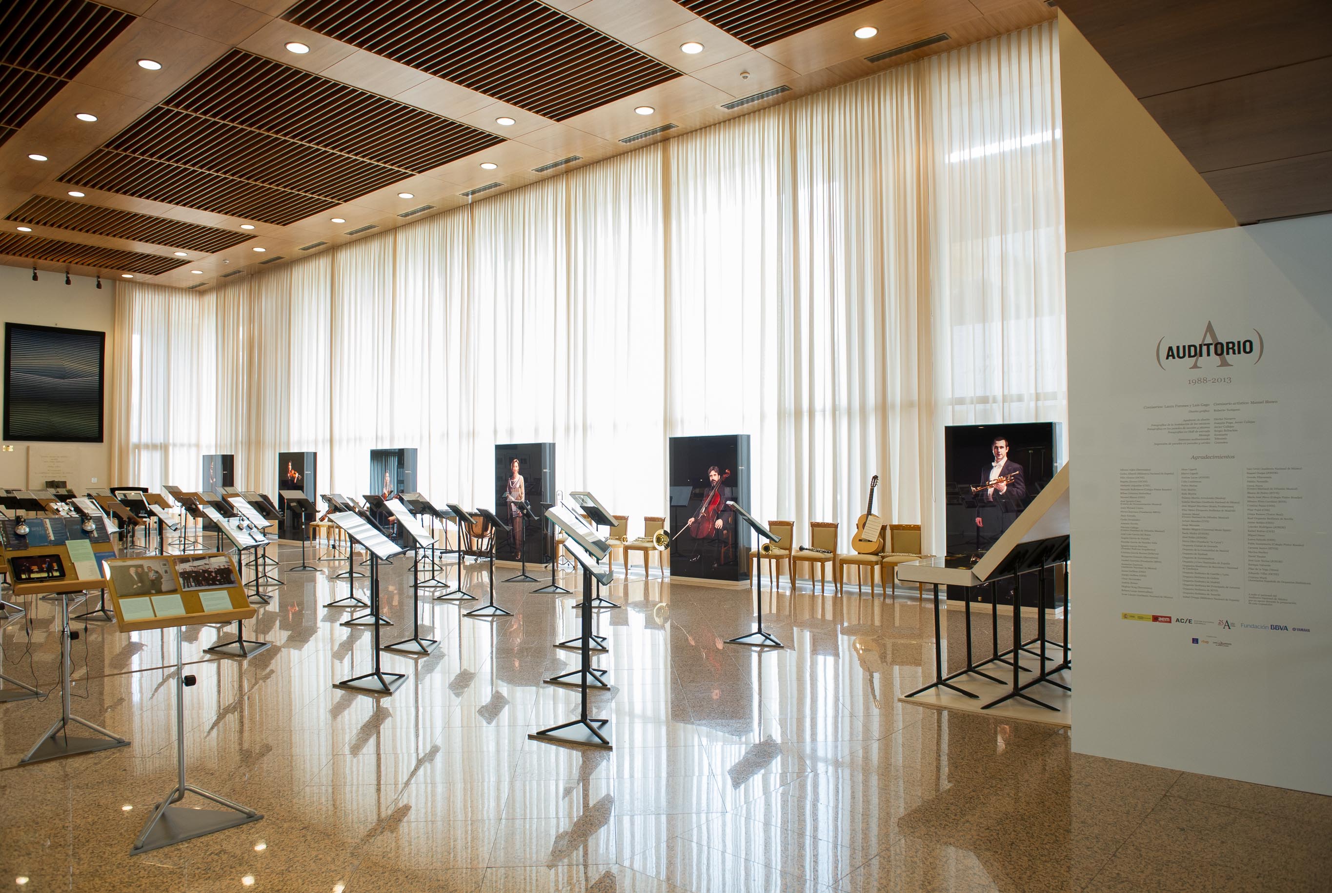 El montaje, ubicado en el emblemático Salón de Tapices y articulado según la disposición de una orquesta sinfónica, recrea 10 secciones orquestales a través de un centenar de atriles en los que se han dispuesto fotografías, partituras, planos e imágenes inéditas de estos 25 años de historia. Auditorio (1988-2013), que podrá ser visitada desde hoy hasta el 25 de julio, es la metáfora de un espacio vivido por el que han pasado los directores, los solistas y formaciones sinfónicas y de cámara más importantes del mundo, ejemplos del legado cultural que la institución ha aportado a la sociedad.