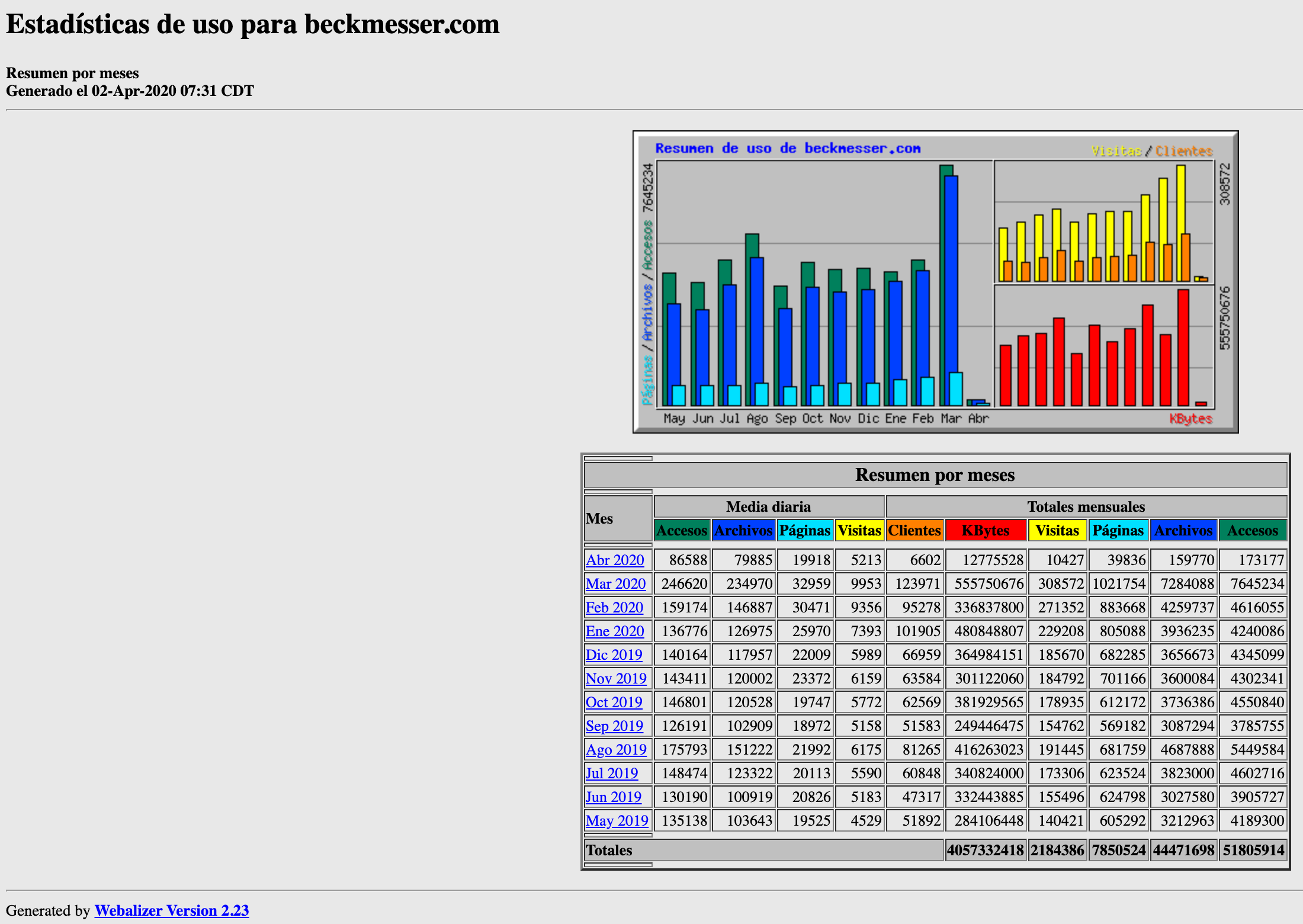 Beckmesser.com es además la única revista web musical que publica abiertamente sus contadores, mostrando una difusión que supera en mucho a todas las editadas en papel y a las demás digitales. La revista musical especializada en papel no supera los 2.500 ejemplares entre suscripciones y ventas. Beckmesser obtuvo 308.572 visitas durante el mes de marzo con 1.021.754 páginas leídas. Otras publicaciones, como Scherzo, según su propia web se quedan en la mitad de páginas, concretamente 633.445, aunque intentan confundir por desconocimiento entre visitas y páginas o intención de su director.