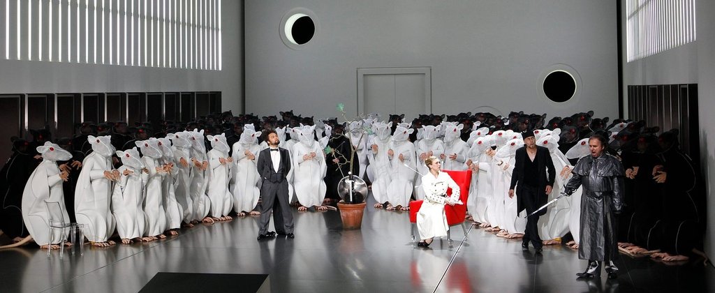 Wagner no sólo redactó sus libretos para que sirviesen mejor a su música y proyecto, sino que escribió libros con su filosofía sobre el drama total y logró un teatro donde representar sus historias y su música. Algunos lo olvidan. La leyenda de la Tetralogía es para ellos simplemente un cuento. El Walhalla no es un castillo sino una tarta que Wotan lleva en sus manos cual camarero. El oso del bosque que ha de atemorizar a Mime es un muñeco de peluche que lleva Sigfrido en sus brazos. A Brunhilda no la separa el fuego del resto de los mortales, sino un patio de butacas, un ultimo acto de la tercera jornada se resuelve entre tres telones arrugados con pobre iluminación…