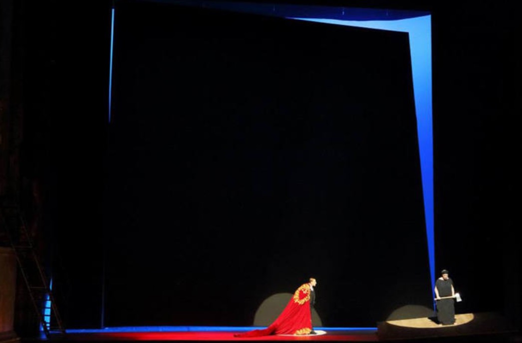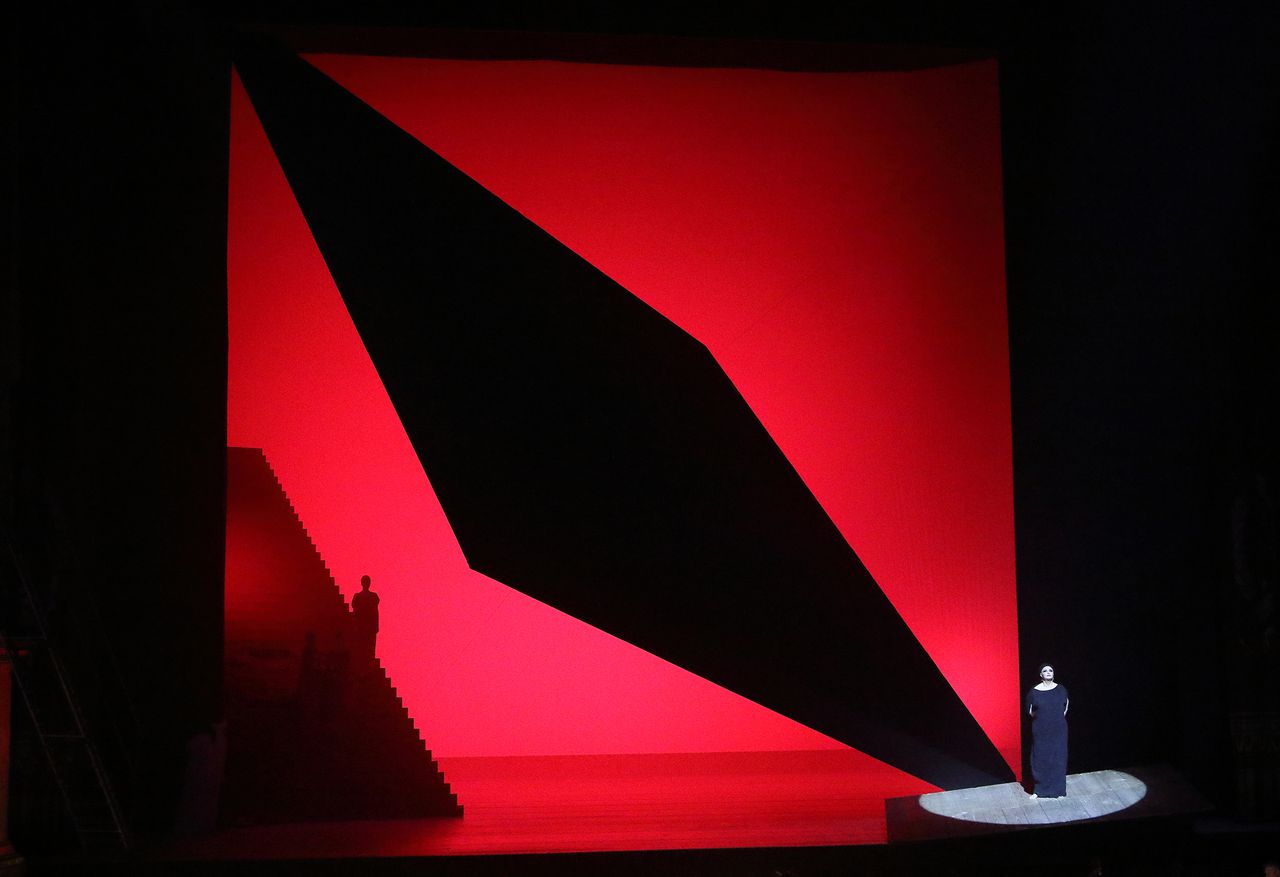 Munich ha vuelto a ofrecer la producción de la casa, que se estrenara en 1997 y que ya había tenido yo ocasión de ver en años anteriores. La producción se debe al desaparecido Herbert Wernicke y resulta poco convincente. Se podría decir que más parece una ópera en concierto que una producción escénica propiamente dicha. La escenografía ofrece un gran un plano inclinado giratorio que cierra el escenario, de modo que la acción se desarrolla siempre en corbata, excepto los dos únicos momentos en que se abre el mencionado plano inclinado: la aparición de Klytämnestra y los acordes finales. Cuando se abre la escena aparece una escalera como único elemento decorativo. En corbata no hay sino una escalera metálica a la izquierda, unida a un palco de proscenio, por donde llega Orestes, y una especie de roca a la derecha, de donde nunca se mueve Elektra.. Vestuario bastante convencional: Elektra con túnica oscura, Chrysothemis de blanco y Klytämnestra en tonos rojos, mientras Orestes lleva un traje de tiempos actuales. La iluminación tiene cierto interés, siendo todos los aspectos mencionados (escenografía, vestuario e iluminación) del propio Herbert Wernicke. Al desarrollarse prácticamente toda la acción en un espacio tan reducido, resulta muy estática.