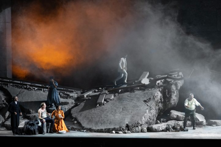 Artífice de todo ha sido el director de escena kazajo Yevgueni Titov, quien ha creado un espacio escénico único acorde con la crudeza de la historia, conformado por los restos de una ciudad destruida que ocupa toda la anchura del inmenso escenario de la Felsenreitschule. Escombros y desolación. Podría ser Gernika 1937, Dresde 1945, Gaza 2025… La terrible eterna canción.