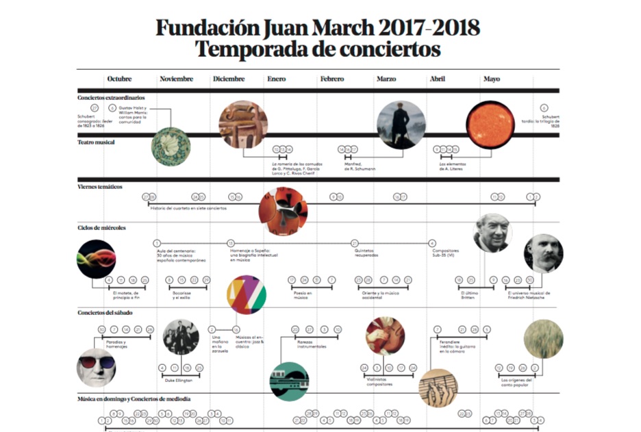 Ayer, la Fundación Juan March ha presentado antes los medios su nueva temporada de conciertos 2017-2018, formada por 150 conciertos articulados en 25 proyectos distintos que incluyen ópera, ciclos de conciertos, zarzuela, jazz, conciertos didácticos y, por primera vez en la Fundación, ballet. Todo esto con un presupuesto de entre quinientos y seiscientos mil euros que darán vida a la ciudad de Madrid con el insólito agradable plus de siempre: todos estos eventos son gratuitos para el público, como siempre ha sido en la Juan March.