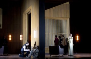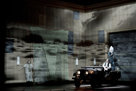 No es esta ópera fácil de transponer a tiempos modernos y Claus Guth sale muy bien parado del intento, ya que, aparte de algunos aspectos puntuales, la cosa funciona muy bien, destacando una dirección de actores magnífica en todos los casos. Hay algunos cambios que introduce y que no afectan a la trama. Melanto pasa de ser la asistenta de Penélope a ser una auténtica secretaria, mientras que su amado Eurímaco pasa a ser el jefe de seguridad de la mansión de Ulises. Ericlea no es la nodriza, sino la sirvienta en este caso. Eumete no será ya un Pastor, sino un jardinero y muy divertido. Minerva pasa a vestir ropajes de mensajera, cuando mueve los hilos de la trama, finalmente. Telémaco es un jovenzuelo, al que los artilugios bélicos le entusiasman, especialmente la idea de conducir el Jeep. La acción se desarrolla con mucha viveza, basada en los rápidos cambios de escena y no se hace en absoluto larga. Como ya he dicho, hay detalles de mal gusto, de los que se debería prescindir, que no hacen sino empañar una labor muy buena por parte de Claus Guth.