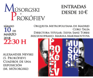 La Orquesta Metropolitana de Madrid y el Coro Talía regresan a la Sala Sinfónica el sábado 10 de marzo de 2018 con su tercer concierto de abono, titulado Músorgski y Prokófiev. La directora titular de las formaciones musicales del Grupo Talía, Silvia Sanz Torre, dirigirá un programa con dos destacadas obras de estos compositores: Cuadros de una exposición y la cantata Alexander Nevski. Marina Makhmoutova, mezzosoprano rusa afincada en España, intervendrá como solista en la cantata de Prokófiev.