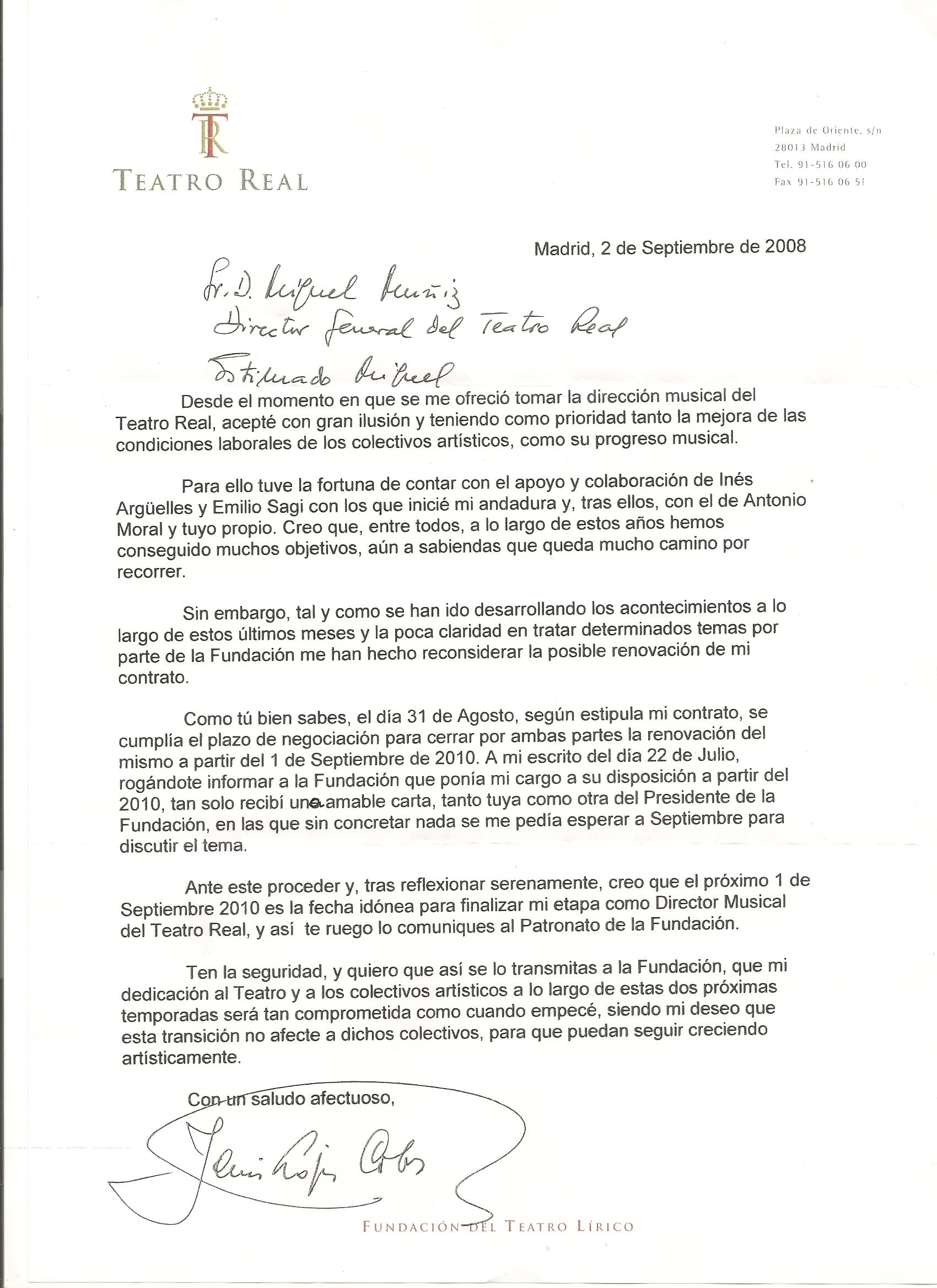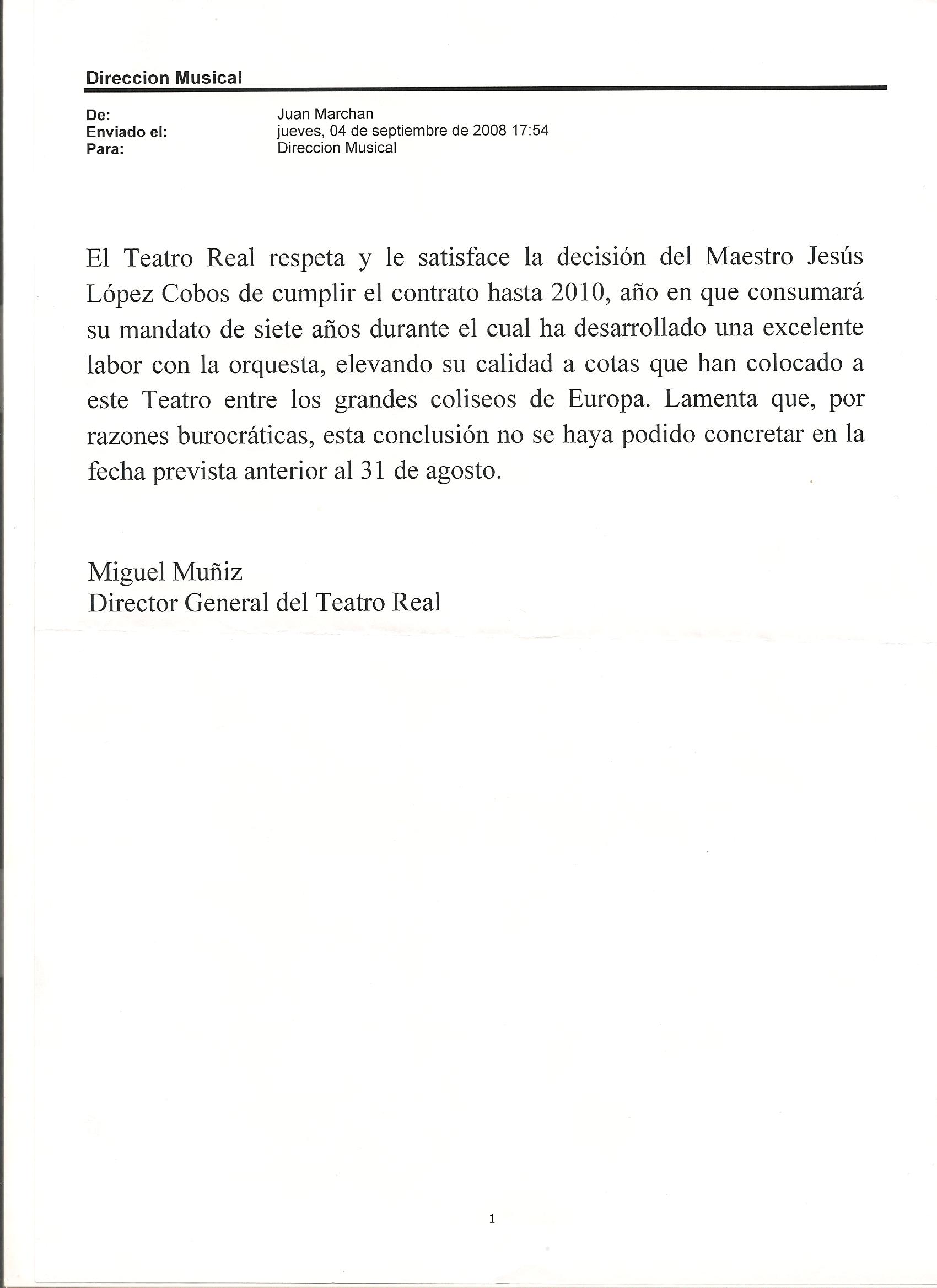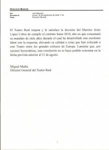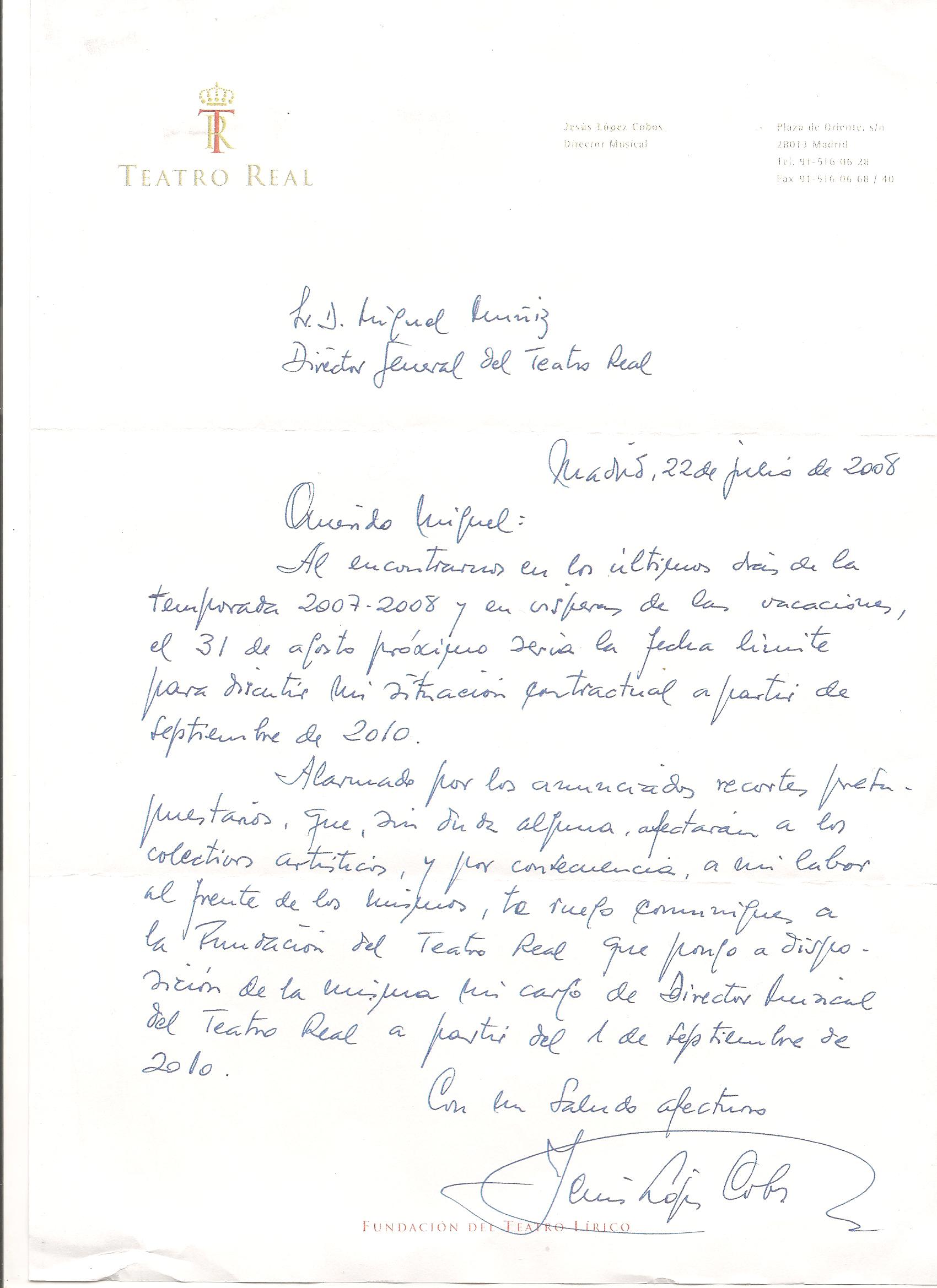He aquí una nueva primicia: las cartas intercambiadas entre Jesús López Cobos y Miguel Muñiz, entonces director general del Teatro Real. El maestro solicita saber los planes del teatro y, al no recibir una respuesta clara, renuncia a renovar su contrato, recibiendo carta de Muñiz tomando nota y agradeciéndole el trabajo realizado.