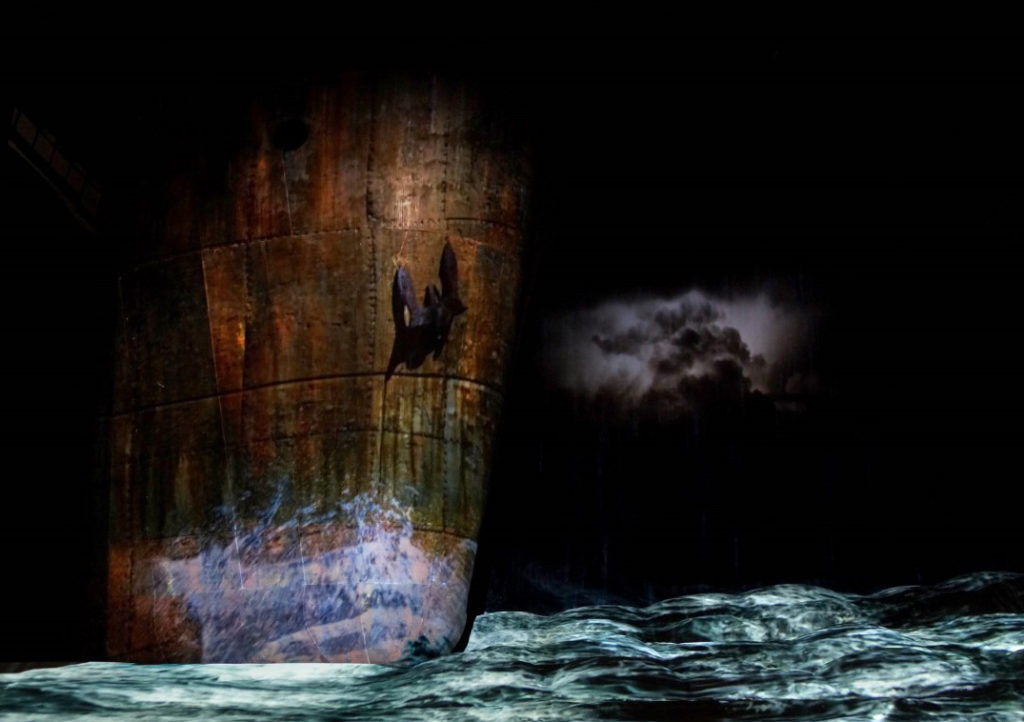 El arranque, a telón descubierto nada más se inicia la Oberura, es impactante: la proa de un barco enorme, una suerte de “Titanic”, que oscila hacia lo espectadores en medio de un mar embravecido. Idea sorprendente de Alex Ollé: sólo hay un barco, el de Daland, y de las bodegas y sentina del navío surgen los espectros que acompañan al Holandés en su eterno periplo: son los fantasmas que viven dentro de nosotros. La siguiente ideación es aún más arriesgada: ubicar la acción, no en las costas noruegas, sino en Chittagon, el mayor puerto de Bangla-Desh, en época actual, y en un completo “cementerio marino” -pero no el del poema de Paul Valery-, donde los incansables técnicos de la Fura van ir desguazando entero el barco en el curso de la obra.