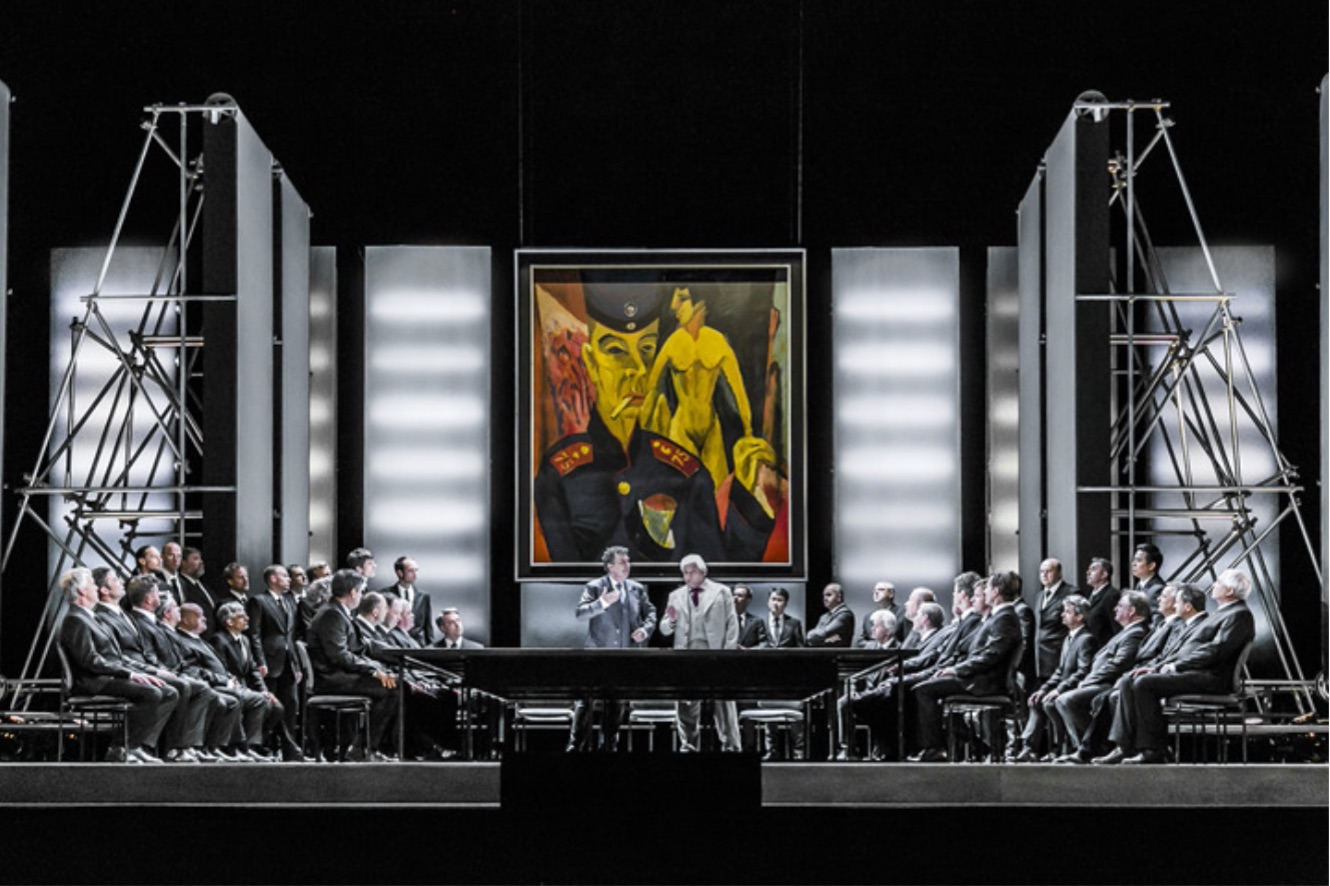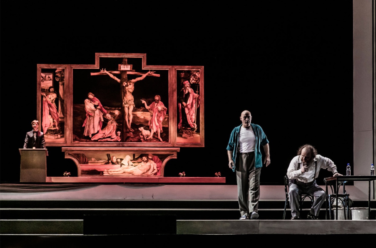 Para la ocasión en Dresde se ha ofrecido una nueva producción, que lleva la firma del alemán Jochen Biganzoli. La acción se traslada del siglo XVI a tiempos modernos y la cosa funciona a medias. Evidentemente, la figura del Cardenal es clave, como lo es la lucha religiosa, y ambos extremos resultan poco adecuados para los tiempos actuales. La escenografía de Andreas Wilkens es casi de corte minimalista, destacando la presencia de algunos cuadros y, especialmente en la Escena 6, el famoso Retablo de Isensheim. Vestuario adecuado de Heike Neugebauer y una buena labor de iluminación por parte Fabio Antoci. En algunos momentos se ofrecen bellísimas proyecciones de imágenes, obra de Thomas Lippick. La dirección de actores y masas es francamente buena, sacando un gran partido del coro. En conjunto, es un buen espectáculo escénico.