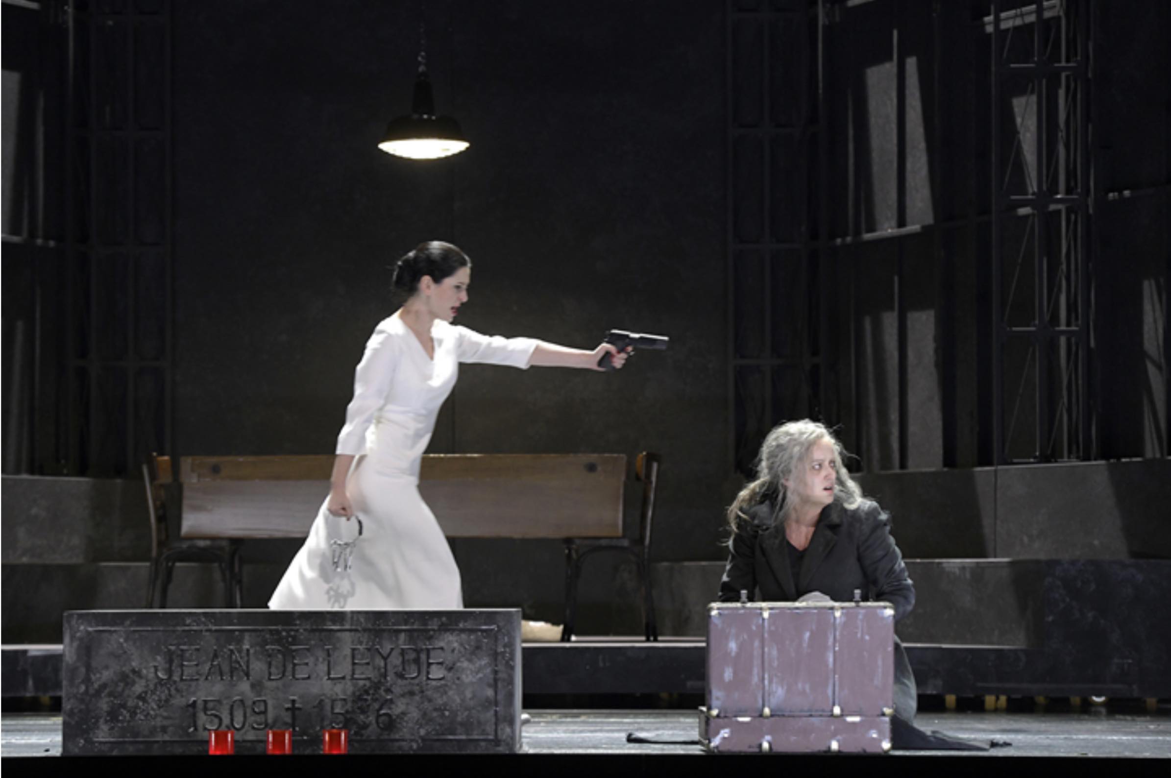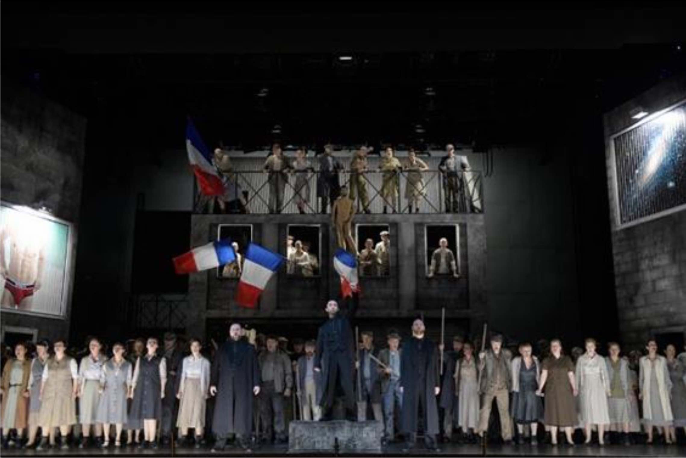 La escenografía y el vestuario se deben a Pierre-André Weitz, ofreciendo como elementos fijos dos paredes laterales que representan dos edificios, mientras que todo el centro y el fondo del escenario ofrecen elementos giratorios, que a veces se mueven en exceso, como ocurre en el caso señalado anteriormente del ballet. Me resultó más convincente la producción en los actos iniciales y finales, en el primero mostrando por un lado los apartamentos de Berthe y Fidès, y por el otro la taberna que regenta Jean. Bien conseguida también la escenografía de la supuesta catedral de Münster en el cuarto acto. Lo menos convincente me resultó el tercer acto, especialmente todo el desarrollo del ballet, en el que el escenario parecía un tiovivo.