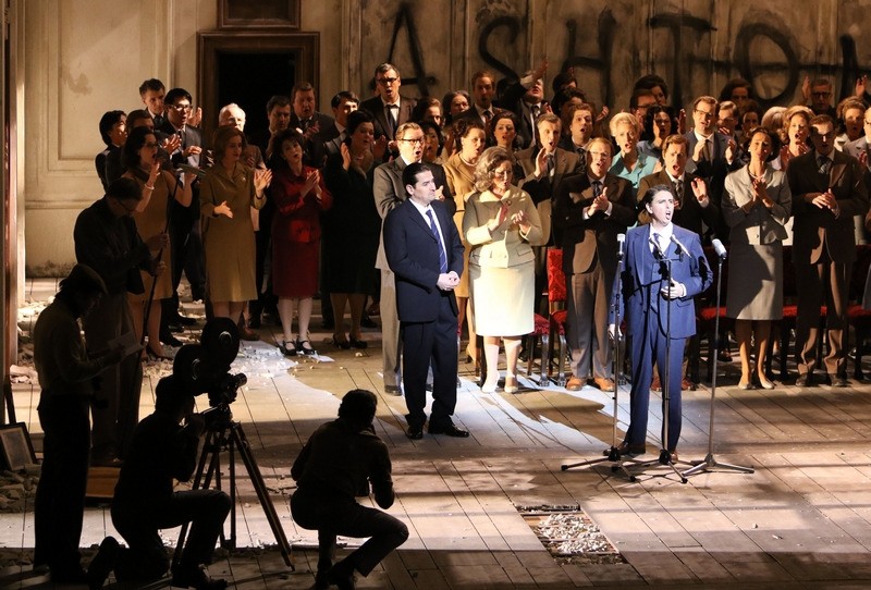 Las trasposiciones de época funcionan únicamente si el director de escena hace un trabajo brillante, lo que no es el caso que nos ocupa. Para Barbara Wysocka Lucia no es la hermana sometida y desequilibrada, sino una mujer moderna que se enfrenta de igual a igual con Enrico en el segundo acto, resultando por demás increíble que acepte el matrimonio con Arturo. La famosa escena de la locura nos presenta a una Lucia enfundando una pistola durante toda ella, amenazando a todo el mundo y la verdad es que uno acaba harto de pistolita en los más de 20 minutos que dura la escena. Llama la atención la entrada de Raimondo en la fiesta de la boda en mangas de camisa y lleno de sangre, lo que me hacía imaginar cómo saldría Lucia a continuación. Pues bien, nada de eso. Lucia sale sin una sola mancha de sangre en su vestido. Quizá lo más absurdo de la escena de la locura y de las que vienen a continuación es la presencia del gran descapotable de Edgardo en el escenario. El vehículo vuelve a aparecer en la escena de la torre de Ravenswood, donde parece que Edgardo ha sufrido un accidente con su coche y, claro, para qué quitarlo. Así que el descapotable sigue en escena.