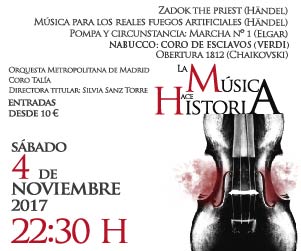 Este sábado 4 de noviembre llega al Auditorio Nacional el primer concierto de la VII temporada de abono de la Orquesta Metropolitana y Coro Talía bajo la dirección de Silvia Sanz con el título genérico de “La Música hace Historia” a las diez y media, en la Sala Sinfónica.