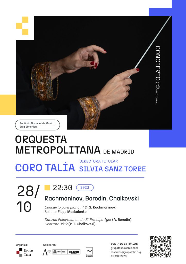 El sábado 28 de octubre a las 22:30 la Orquesta Metropolitana de Madrid y el Coro Talía, bajo la batuta de su directora titular, Silvia Sanz, inauguran su XIII Ciclo Sinfónico Coral en el Auditorio Nacional de Música. Para el primer concierto de la temporada, el Grupo Talía presenta un programa de corte romántico: el Concierto para piano nº 2 de Rachmáninov, las Danzas polovtsianas de El príncipe Ígor de Borodín y la Obertura 1812 de Chaikovski. El gran concierto de Rachmáninov supondrá la presentación en el Auditorio Nacional de Filipp Moskalenko, un joven y prometedor pianista cuyo talento ya ha sido reconocido en concursos nacionales e internacionales.