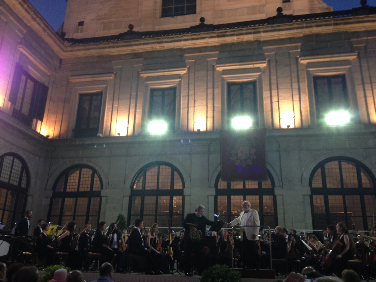 ¡Cuidado que San Lorenzo de El Escorial tiene potencia y qué mal aprovechado se halla! La coordinación entre Ayuntamiento, Patrimonio Nacional, Comunidad de Madrid e instituciones privadas brilla por su ausencia. Ni en la web del Ayuntamiento ni en la de Turismo de la villa se anuncian coordinadamente los eventos que tienen lugar. Así poco se ayuda a evitar el cierre de hoteles, restaurantes y comercios que padece el más bello, impresionante y emblemático lugar de la Sierra madrileña. Obviamente esta coordinación le corresponde al Ayuntamiento pero ¿existe éste? Realmente parece desaparecido. Por eso no resulta extraño que se ofrezca un concierto gratuito en el Patio de Carruajes del Monasterio y no se llene a pesar de contarse con una excelente orquesta, un solista afamado y uno de los grandes compositores vivos de la actualidad. Ni la belleza de las partituras, ni su ejecución en un ambiente tan especial logran llegar al gran público porque éste desconoce su celebración.