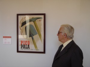 Gonzalo Alonso Rodríguez posa junto a los carteles que pintó durante en la Guerra Civil, expuestos en la Fundación Pablo Iglesias