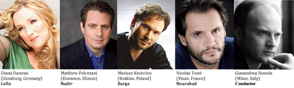 Diana Damrau lidera el elenco como la sacerdotisa Leïla, junto a ella en el escenario Matthew Polenzani como Nadir, Mariusz Kwiecien como Zurga, y Nicolas Testé como el sumo sacerdote Nourabad.