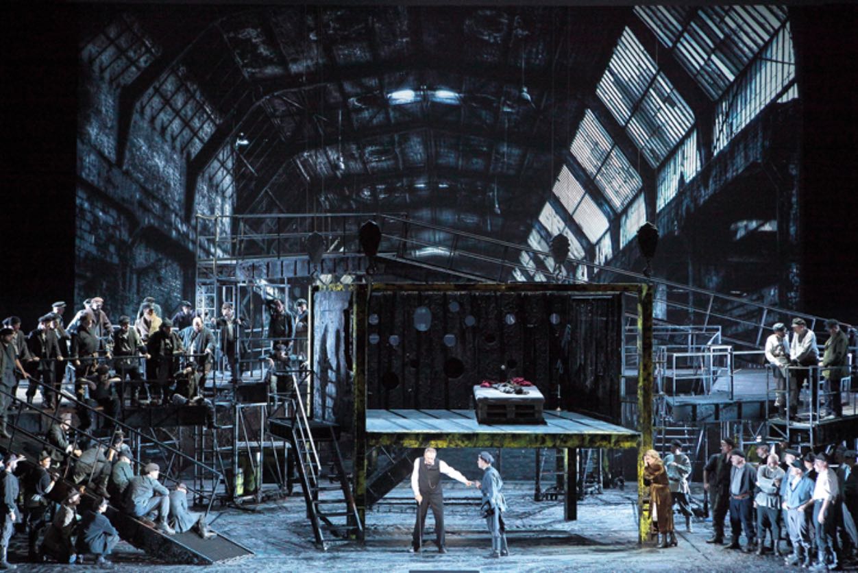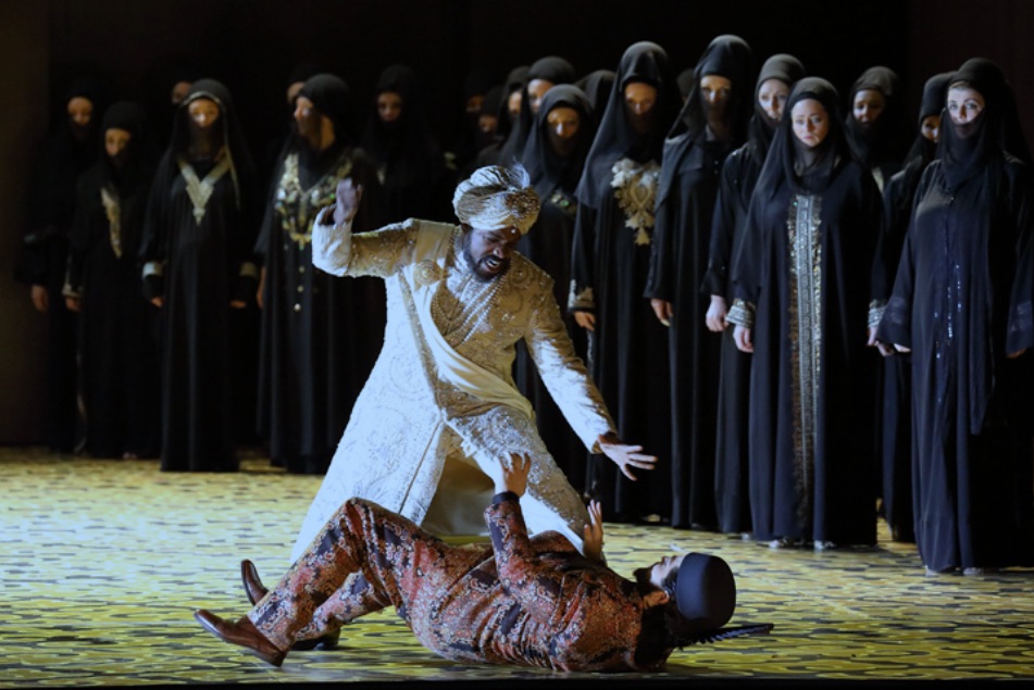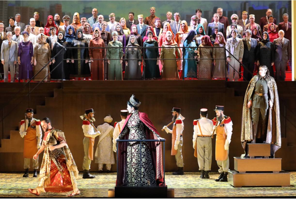 Así pues, se trata de la primera reposición de la producción del americano David Alden, que trae la acción a tiempos modernos en un medio musulmán. La producción sirve bien a la trama y no molesta, lo que no es poco en una producción moderna. La escenografía de Paul Steinberg se basa en una serie de módulos en forma de paredes móviles, cuyos simples movimientos hacen cambiar la ubicación de las escenas con gran facilidad. Con pocos movimientos pasamos del templo al palacio de Semirámide o a las habitaciones de la Reina y, finalmente, a la tumba del asesinado Rey Nino. Las paredes se completan con fotos de la familia de Nino y Semiramide. El vestuario de Buki Shiff resulta atractivo en el caso de Semiramide y del Coro de musulmanes. Hay un buen complemento de proyecciones de videos, cuyo autor es Robert Pflanz. La correcta iluminación corre a cargo de Michael Bauer, como casi siempre en Munich. En conjunto, me parece un buen trabajo de David Alden, aunque creo que podría haber sacado más partido al movimiento de masas. La dirección de actores es siempre adecuada.