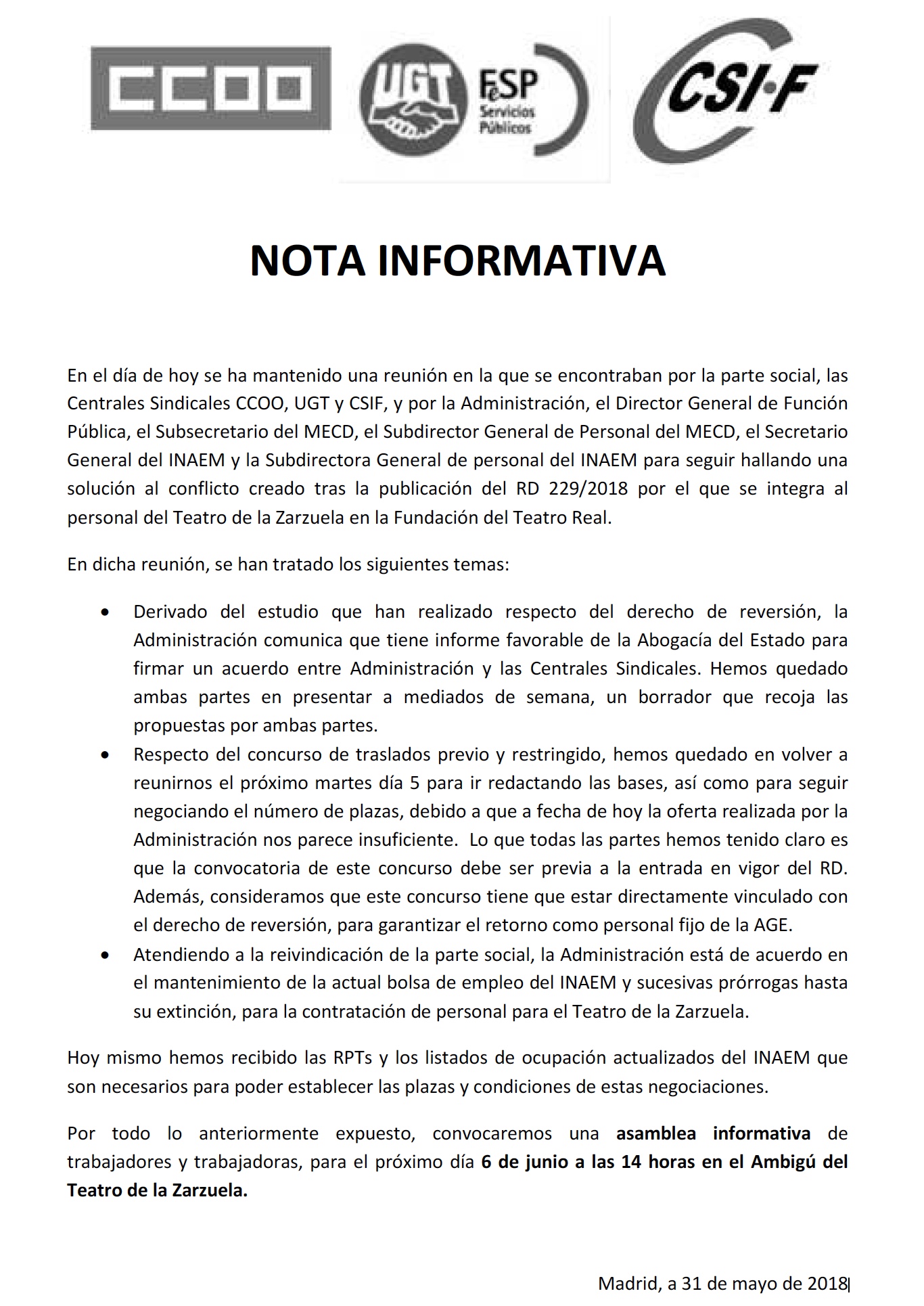 Las cosas podrían complicarse para la unión de los teatros Real y Zarzuela. Los sindicatos piden al nuevo gobierno una reconsideración y la derogación del Decreto Ley, no vigente hasta la aprobación de los Presupuestos Generales del Estado y, parece ser, la firma del oportuno documento por la Intervención General de la Administración del Estado. Adjuntamos comunicado sindical.