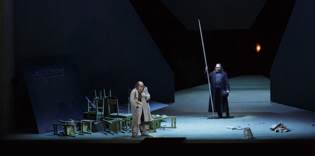 La escenografía de Wolfgang Gussmann ofrece prácticamente un escenario único, consistente en dos paredes laterales e inclinadas, que junto con un panel de cierre por detrás ofrecen un escenario reducido en la cueva de Mime, donde más se adivina que se ve la fragua, resultando penosa la entrada de Siegfried con un oso de peluche. En el segundo acto estamos con las mismas paredes, quedando la parte delantera cubierta por sillas (parecen una obsesión del regista), cerrando la escena una especia de teatrillo, que se supone es la caverna de Fafner. ¿Qué hacen estas sillas en medio del bosque? No es fácil de adivinar, la verdad. Finalmente, las dos primeras escenas del tercer acto nos llevan prácticamente el escenario del primero, pero sin elementos de atrezzo, estando bien resuelta la aparición de Erda. Finalmente, el dúo de Siegfried y Brünnhilde tiene lugar en el escenario anterior, ahora totalmente cerrado y con nubes proyectadas en todas las paredes. El vestuario sigue siendo obra de Wolfgang Gussmann y Frauke Schernau y no tiene relevancia, llamando la atención que ahora Brünhilde se despierte con un vestido rojo, que nada tiene que ver con el que llevaba cuando Wotan la durmió. No sé si aquí ocurre también que no estaba dormida, sino que estaba de parranda. Mejor sin butacas, pero producción sin interés.