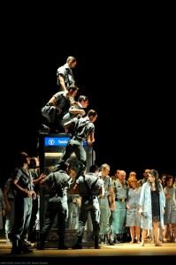 Esta producción no es sino la que Calixto Bieito estrenara en el Festival de Perelada en 1999 y que luego viajó bastante por Europa. Posteriormente, se rehizo para las representaciones del Liceu de Barcelona en el año 2010, siendo coproductores Palermo, Turín y Venecia. En una concepción minimalista traslada la acción a tiempos modernos – posiblemente años 70/80 del siglo pasado -, lo que resulta perfectamente adecuado, pues no hay que olvidar que el personaje de Carmen finalmente no es sino un mito y estos son intemporales. Como Elektra o Salomé, también Carmen puede adaptarse a cualquier época y, particularmente a la nuestra, ya que el enfrentamiento entre dos maneras de entender la vida – libre y sin ataduras en el caso de Carmen, y tradicional y machista en el de Don José – siguen teniendo una gran actualidad. Como digo, la producción escénica es minimalista con una escenografía (Alfons Flores) que ofrece un espacio vacío, rodeado de una especia de barrera circular. Los cambios de algunos pocos elementos escénicos crean la ambientación necesaria. Una cabina telefónica y un gran mástil en el Acto I, un Mercedes en el acto II (el menos conseguido), más Mercedes y un toro de Osborne en el tercero, y el escenario vacío para el último acto. Evidentemente, las transiciones entre actos son rapidísimas. El vestuario de Mercé Paloma está bien hecho, con los coralistas y figurantes masculinos vistiendo uniformes de la Legión, las cigarreras con las batas de trabajo que se usaban entonces, y un vestuario colorista para el resto de las escenas. Buena la iluminación de Alberto Rodríguez, aunque curiosamente en Barcelona era Xavi Clot. Esta producción elimina casi todos los diálogos.