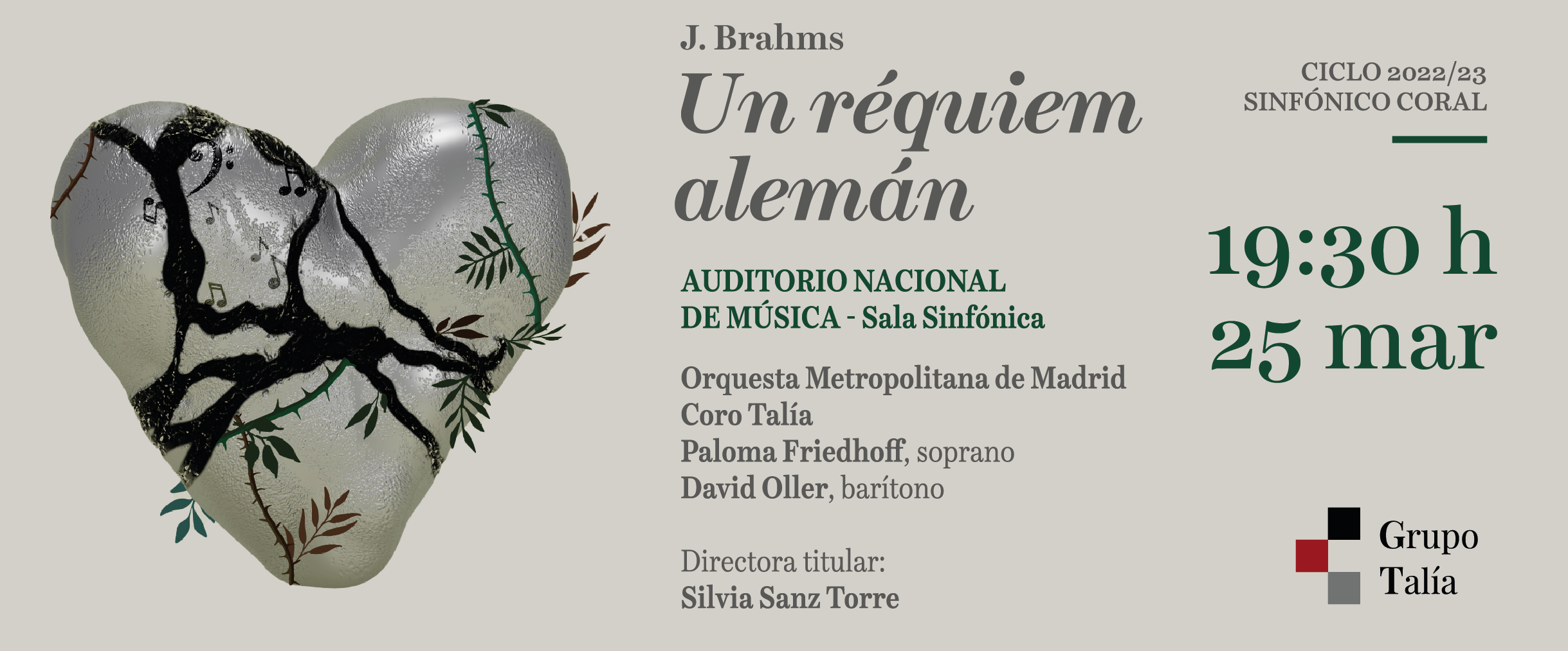 La gran obra de Brahms está ligada a un momento clave en la historia del Grupo Talía. Se interpretó y grabó en vivo el 21 de mayo de 2011 en el Auditorio Nacional de Música. Para su interpretación Silvia Sanz crea la Orquesta Metropolitana de Madrid. A partir de entonces, el Grupo Talía, fundado por la directora en 1996, contó con una formación sinfónica propia y estable, lo que hizo posible la puesta en marcha de una temporada de abono en el Auditorio Nacional. 12 años después y en el XII Ciclo Sinfónico Coral de La Metropolitana y el Coro Talía, Silvia Sanz vuelve a enfrentarse a este gran reto: “Aunque mi intención era interpretarla de nuevo en 2021, cuando se celebraba el X aniversario de la Orquesta Metropolitana y el XXV del coro, tuvimos que retrasarla debido a la pandemia por problemas con el aforo en los conciertos y la imposibilidad de hacerla con los efectivos orquestales y corales que son deseables. Ahora es el momento de disfrutarla de nuevo”.
