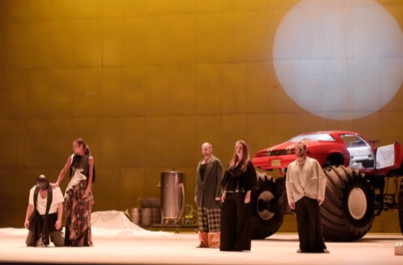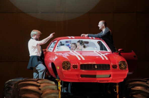 El autor de esta nueva producción es el director de escena argentino Rodrigo García, que tiene una larga experiencia teatral en su país natal, así como en España y Francia, y que, si no falla mi información, hace su debut en el mundo de la ópera. Hay que decir que estamos suficientemente acostumbrados a producciones rompedoras como para que no nos llame la atención una más. En este caso, sin embargo, se dan unas circunstancias especiales, que hacen que el trabajo escénico de Rodrigo García resulte rechazable. Para empezar, de la ópera El Rapto en el Serrallo no hay en esta producción sino la música de Mozart. Los diálogos desaparecen totalmente, al parecer por no ser del gusto del señor Garcia, y se sustituyen por unos breves diálogos en inglés, que llegan amplificados a la sala, y que son subidos de tono y poco edificantes en muchos casos. La trama, evidentemente, no es exactamente la que se contiene en la ópera de Mozart. Estamos en tiempos actuales y parece que Konstanze, Blonde y Pedrillo han sido abducidos por ovnis y llevados a un lugar desconocido, donde impera el amor libre (al que se entregan con buena dedicación los europeos abducidos) y dominado por una 2 atractiva Bassa Selim, que los tiene más bien como invitados que como prisioneros. Belmonte, junto con dos jóvenes prostitutas, se monta en un coche rojo, que va encima de unas grandes ruedas de tractor, y aparece por los dominios de Selim, encargándose con Pedrillo de dirigir el laboratorio, en el que no parece que hacen otra cosa que drogas amorosas, a juzgar por los resultados en escena. La huida de los europeos, su subsiguiente captura y la liberación final no resulta entendible en este ambiente, terminando la obra -¡cómo no!´- con la intervención de la señora Selim, que nos anuncia que en la próxima estación de servicio Konstanze abandonará a Belmonte y volverá en autostop, ya que con ella se vive mejor que con nadie.