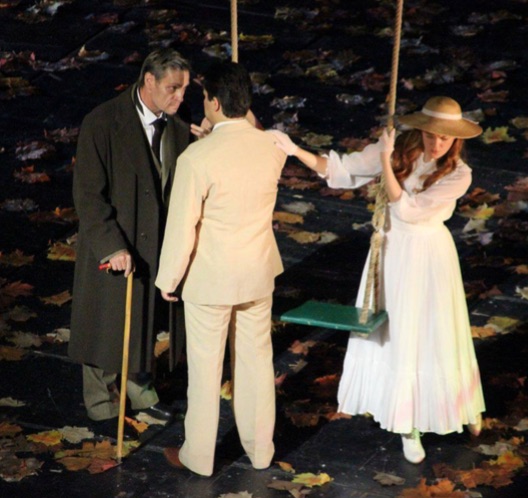 Detrás se puede ver la gran lámpara caída y el columpio en la oscuridad. El vestuario de Carlo Diappi no tiene interés, abusando de tonos oscuros en la fiesta de Flora. En este ambiente lo lógico es esperar el lucimiento del responsable de iluminación, Wolgfgang Göbbel, pero tampoco ocurre semejante cosa.