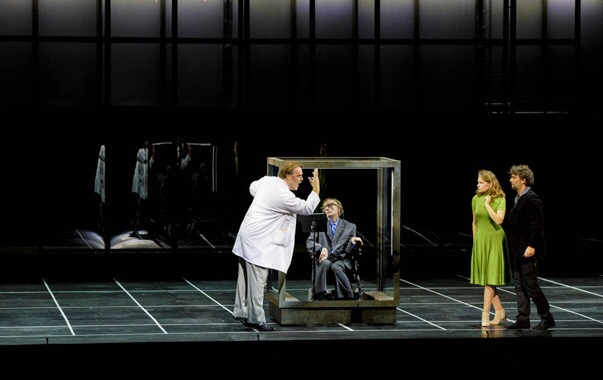 La verdad es que había sobradas razones para el profundo desacuerdo. Hermanis debutaba con un Berlioz que reinventa totalmente. La filosofía ha muerto, incapaz de hallar respuestas, y la ciencia intenta ocupar su lugar. Ésta se escenifica en un Stephen Hawking, actuado por un veterano bailarín de Pina Bausch, que se pasea permanentemente por el escenario en su silla mecánica salvo en el final. ¿Quién es Fausto en nuestros días? Aquellos que pretenden ir a Marte en una expedición sin retorno posible, organizada para dentro de veinte años. El viaje de Fausto a su juventud es un viaje interplanetario. Cierto es que el libreto incluye las palabras insecto o rata, pero de una forma marginal, no como para que el regista divida la escena en dos partes horizontales y en la superior se dedique a proyectar ambos bichos, mamíferos marinos, caracoles copulando, erupciones volcánicas o lo que le viene en gana, por muy bellas que sean algunas de las imágenes, al tiempo que en la inferior se pasea Hopkins mientras Fausto, Mefistófeles, Margarita o Brander son personajes prácticamente hieráticos, pasmarotes. Se quejaba Kaufmann, con razón, de que con tres grandes actores-cantantes como Koch, Terfel y él mismo algo más se les podría haber diseñado hacer. En definitiva, un viaje a Marte sin comandante en la tripulación.