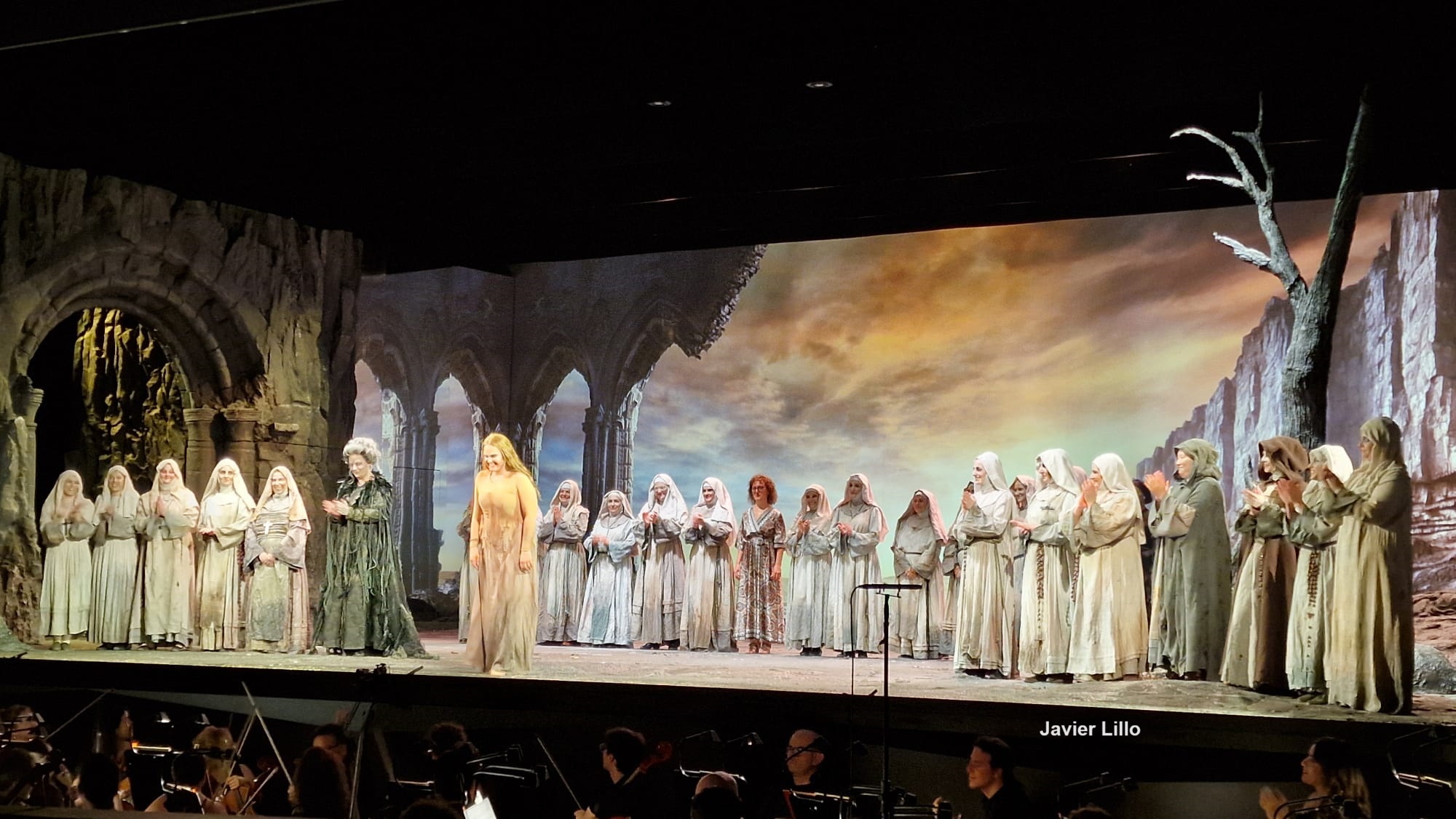 Chiara Isotton será también Suor Angelica en la siguiente pieza (en Bilbao hará también este papel). La acción se sitúa en los jardines de un convento con una escenografía que nos presenta el mar al fondo y unos árboles al frente. Aquí las monjas expresarán sus reflexiones sobre su abandono del mundo, esperando el cielo en la vida futura. No en vano aquí Puccini nos representa el purgatorio, ese estado intermedio entre cielo e infierno, así como en la tierra estas monjas están entre la vida y la no vida.