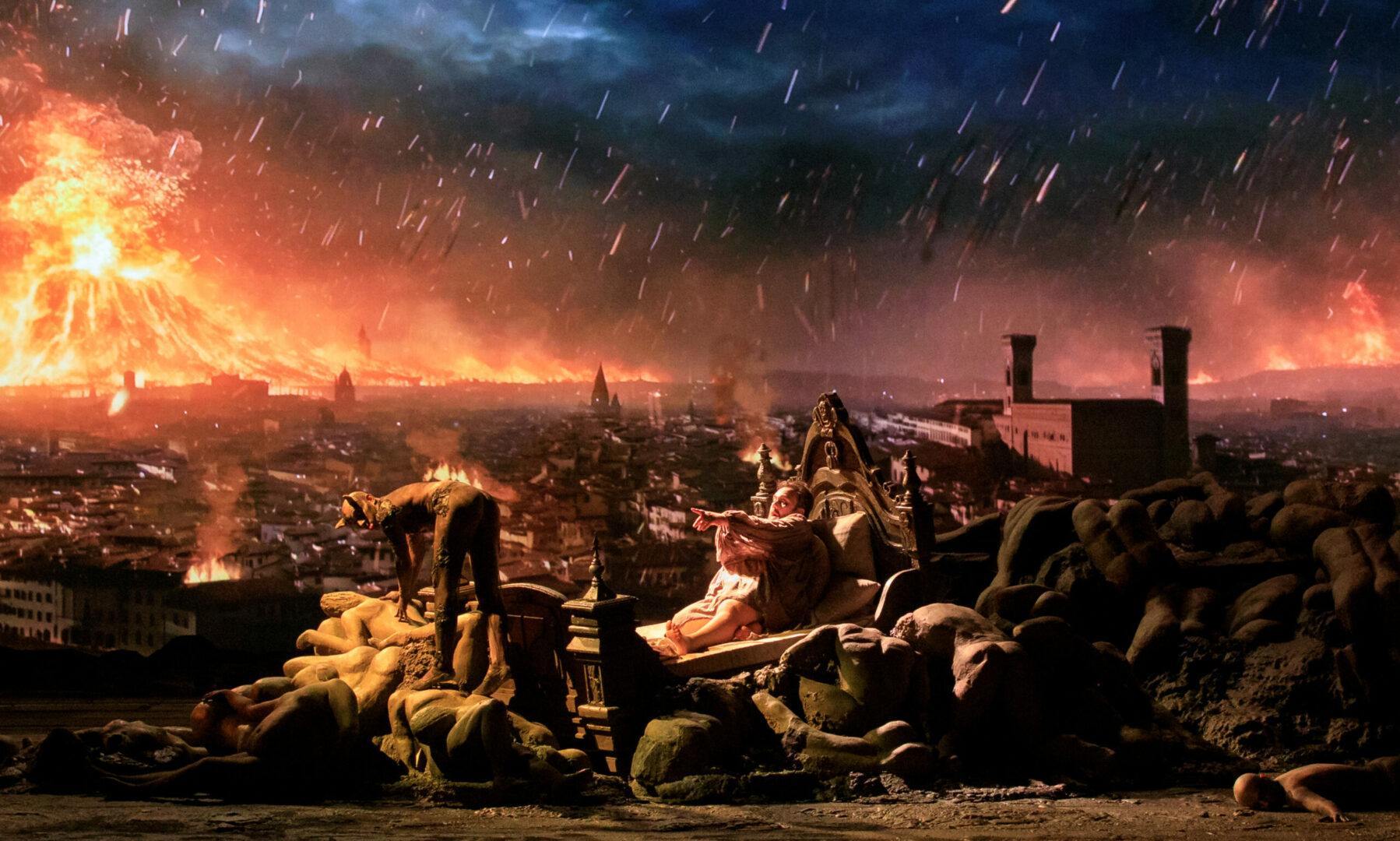 La escenografía nos muestra en la pantalla cuerpos humanos semidesnudos con la ciudad de Florencia al fondo, inspirados en los grabados del infierno de Gustave Doré pero también, y así lo confiesa el director de escena, en la película ‘What Dreams May Come’ (‘Más allá de los sueños’, en español), donde Robin Williams camina sobre cabezas humanas y aquí se presenta una cama mortuoria y mobiliario formado por el mismo tipo de figuras humanas de la pantalla sobre la que los personajes de la ópera y en especial el difunto y el protagonista se mueven o reposan.