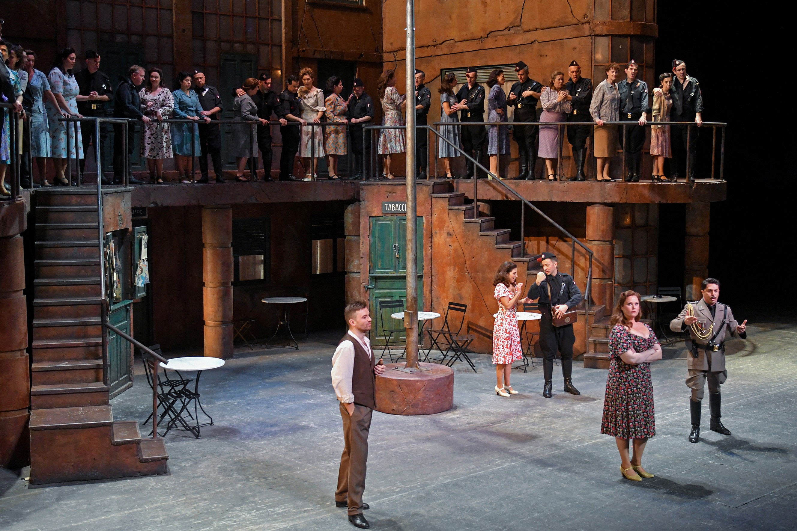 La acción se traslada a la Italia fascista, con la tropa de Belcore convertida en “camisas negras”, en un escenario único en forma de patio vecindad. La dirección escénica sigue funcionando francamente bien, llena de detalles del agrado del público, como la llegada de Dulcamara en un “sidecar”, la gente asomada a las ventanas en “O, rustici”, el divertido banquete de bodas, que abre el segundo acto, acompañado de música napolitana a cargo de Beniamino Gigli, terminando con el divertido paseo de Dulcamara y Moretto por el patio de butacas, repartiendo “elixir”, mientras el “León Salvador” de mi niñez canta de nuevo las estrofas de su despedida. Escenografía muy adecuada, obra de Marcelo Grande, autor también del diseño de vestuario. Correcta la iluminación de Quico Gutiérrez.