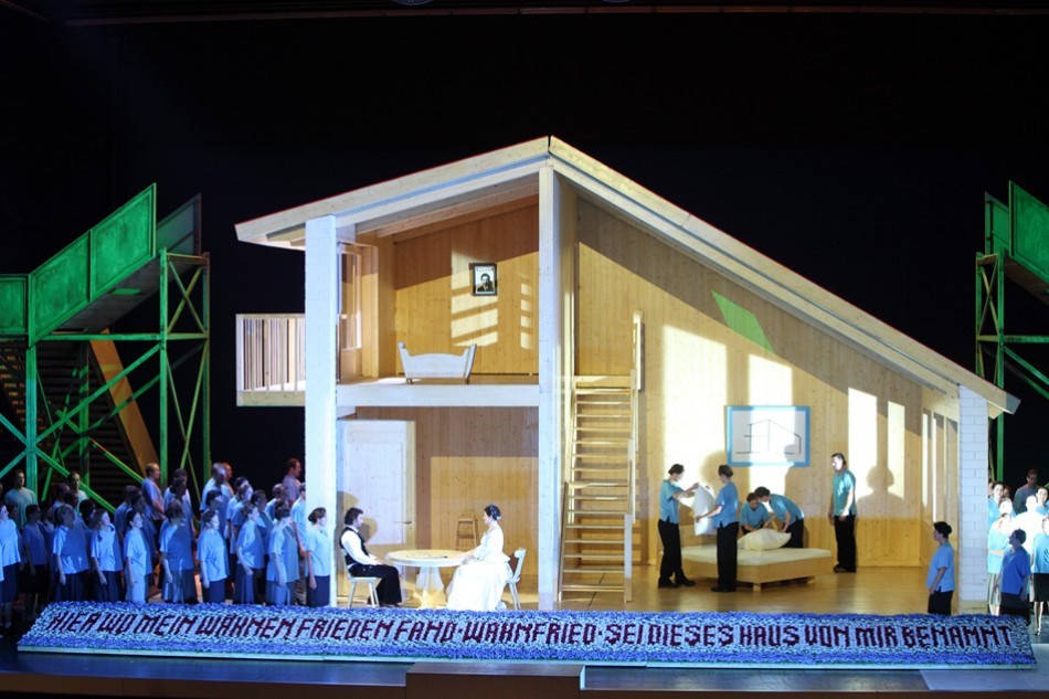 La trama se trae a tiempos modernos, seguramente a los años 60 del pasado siglo, y Elsa quiere construir una casa, labor a la que se entregrará posteriormente Lohengrin. El simbolismo de la construcción de algo no está mal traído, si pensamos más en una nueva sociedad o hasta en un amor que en una casa. Lo cierto es que la casa va levantándose acto a acto, ocupando toda la escena finalmente, y la verdad es que uno acaba bastante harto de ladrillos y cemento. La originalidad de Mr. J ones consiste en que Lohengrin queda abatido ante las preguntas de Elsa en el tercer acto y prende fuego a la casa que han construido, rociándola con gasolina. La escena final consiste en un suicidio colectivo de todo el coro, al abandona rles Lohengrin. Cualquiera se dará cuenta que estas ideas no pueden hacer sino chirria r con el texto y la música. El coro canta como si estuviera en una versión de concierto, aunque con trajes, mientras que la dirección de actores no pasa de la r tina. Para el a rchivo diré que a escenografía y el ramplón vestuario son de Ultz y la floja iluminación es de Mimi Jordan Sherin.
